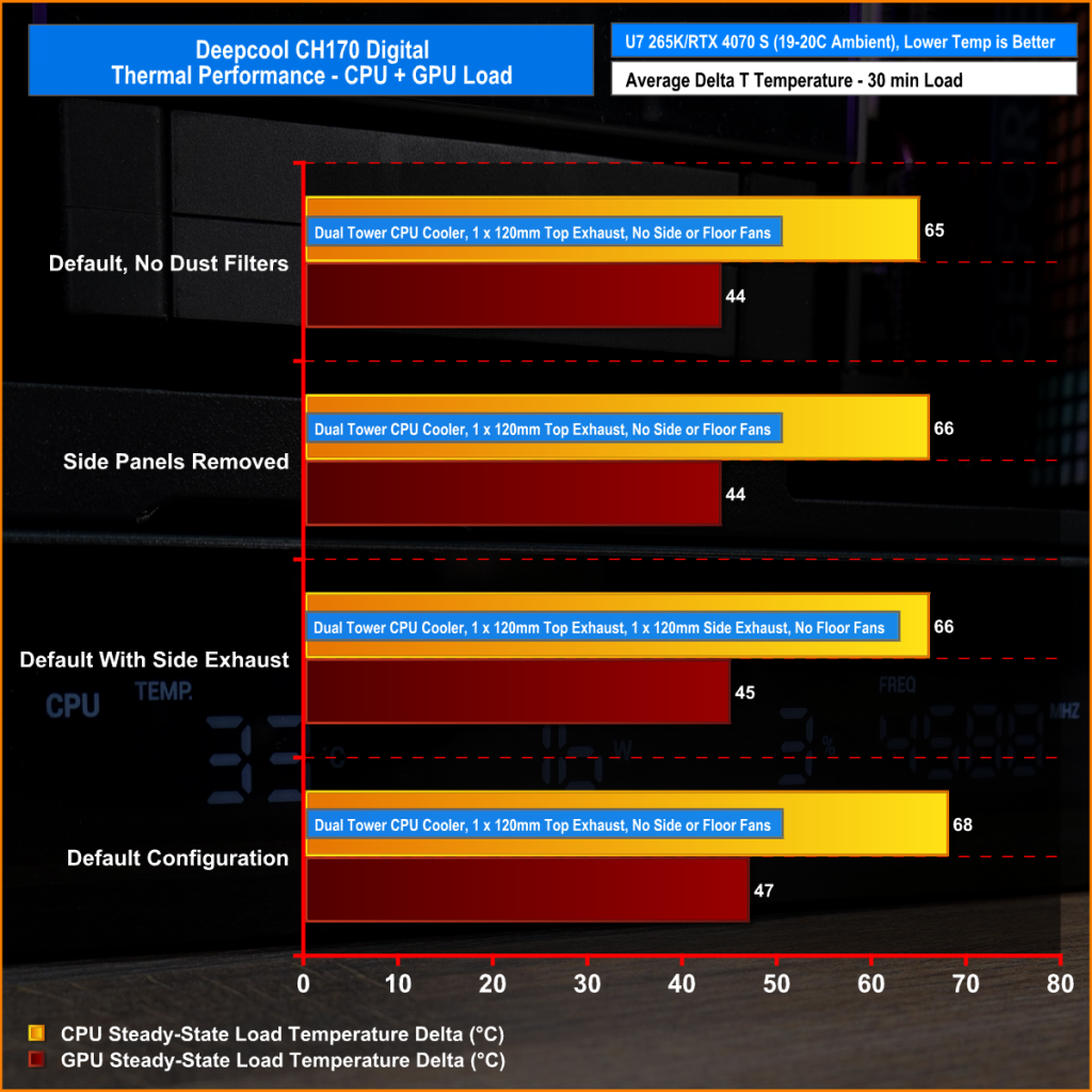 CPU temperature is at its peak with the case in the default configuration at 67°C over ambient. While the GPU in this configuration averages 47°C over ambient. When changing the case configuration, the most noticeable effect on temperature is when the dust filters are removed. CPU temperature drops by 3°C and the GPU average temperature drops by the same amount.