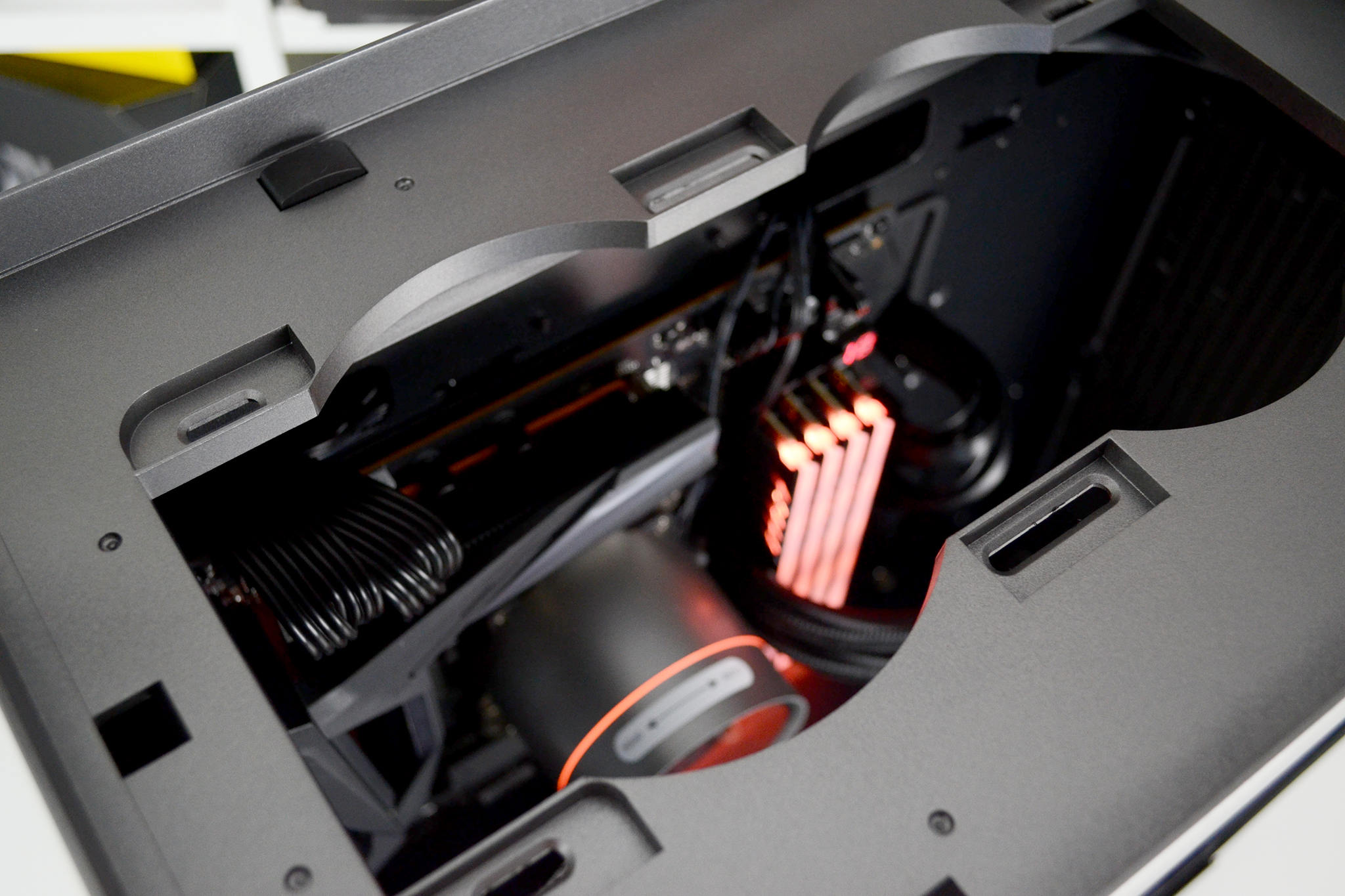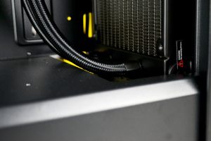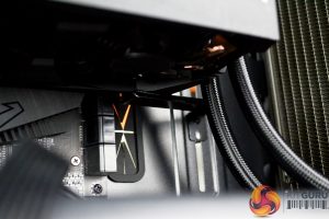 For CPU cooling of this build, we chose the Deepcool Castle 280EX AIO cooler. Installation of the radiator at the front of the case worked well, positioning the cooler with the tubing inlet/outlets at the bottom was possible since the tubing just cleared the PSU shroud.