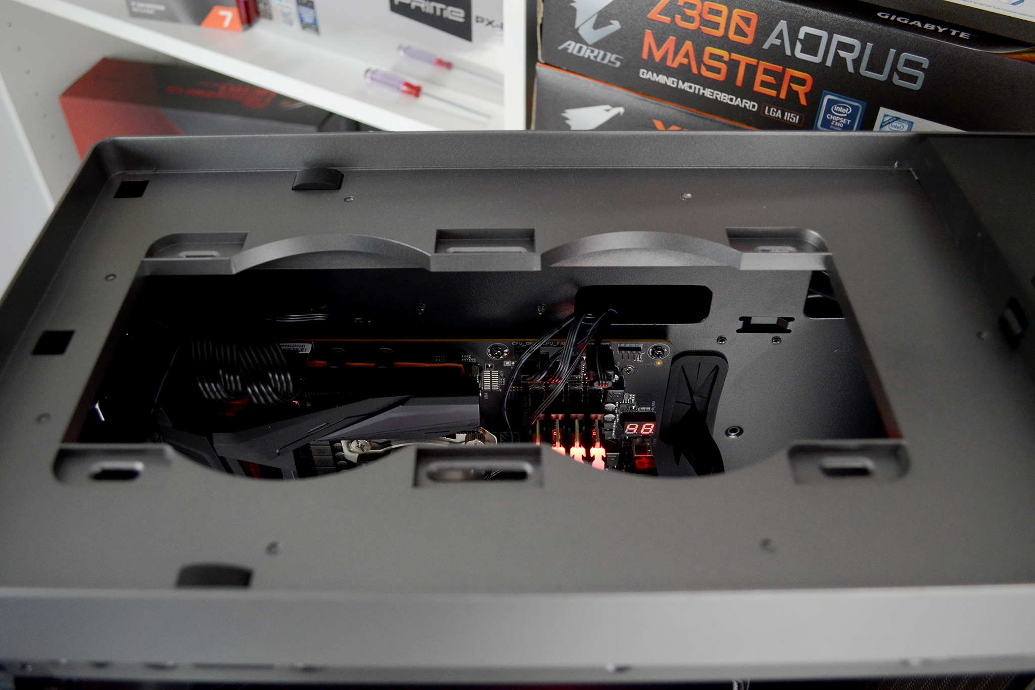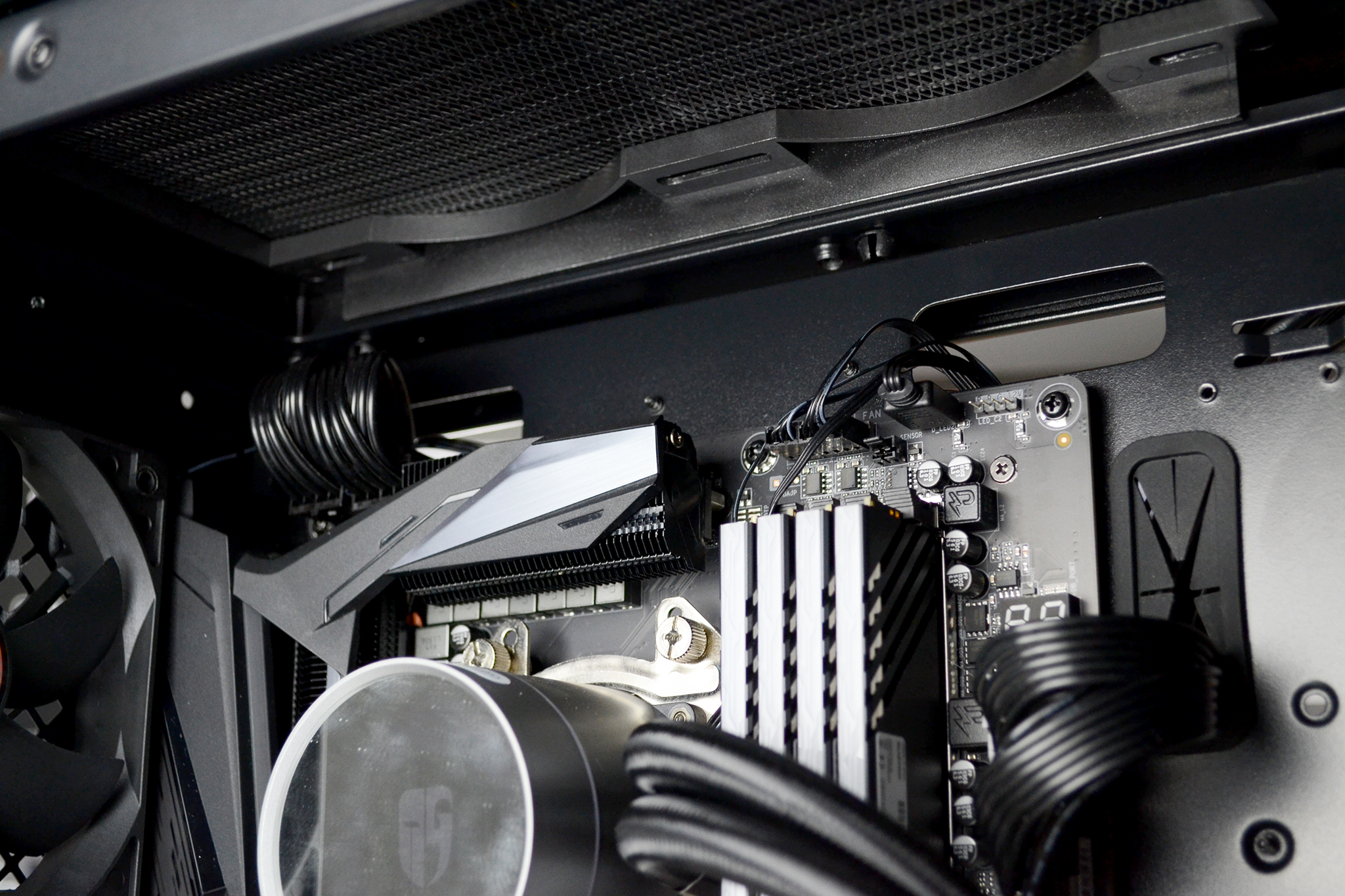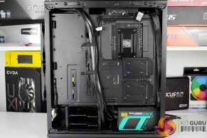 With the motherboard fitted in position, we can see that there is approximately 60mm of space between the top panel and the motherboard VRM heatsink, so this should provide enough space for installing fans or a radiator in the top panel without interfering with motherboard components.