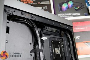 There are plenty of additional cable tie eyelets at the front of the case for managing fan cables and at the rear of the case for tidying up the EPS power cables that run to the top of the motherboard. This was quite a basic system we built but still, the cable management turned out to be very neat in the end.
