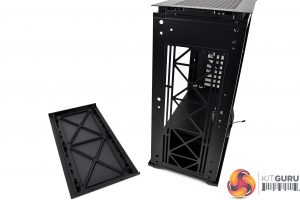 Usually, behind the right-hand side panel of a PC case is a little boring, but there is quite a lot going on in the Macube 310P here. At the bottom is a full cover power supply shroud with anti-vibration rubbers for the power supply to rest on, as well as a HDD cage that has adjustable positioning or can be completely removed to make way for a larger PSU.