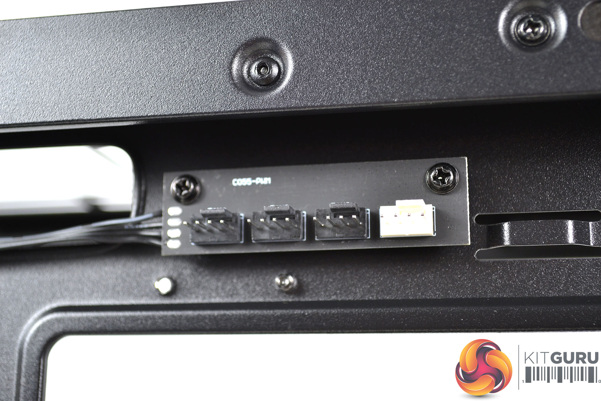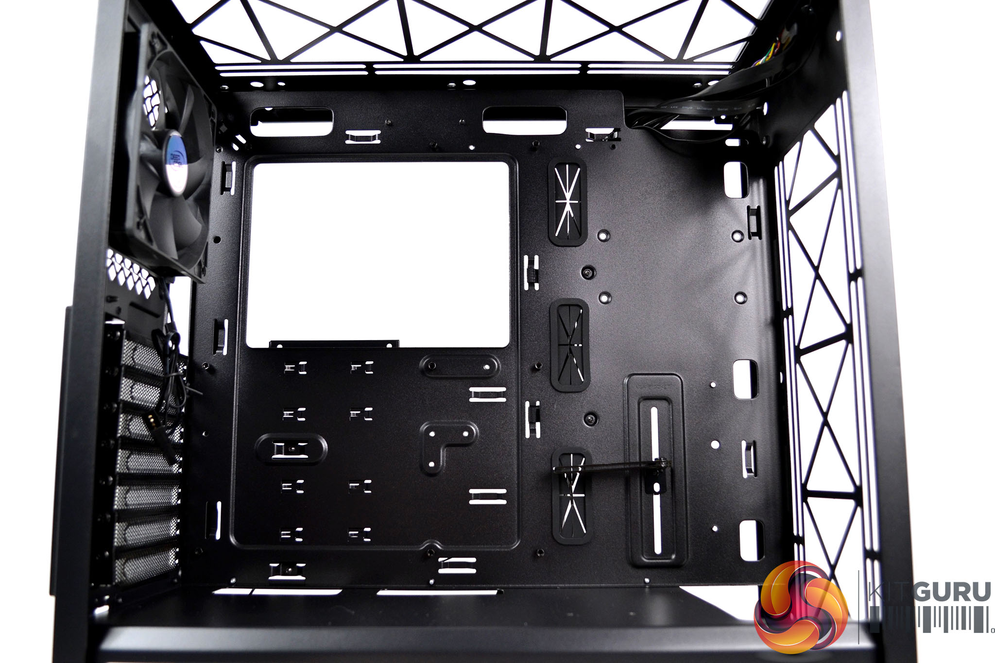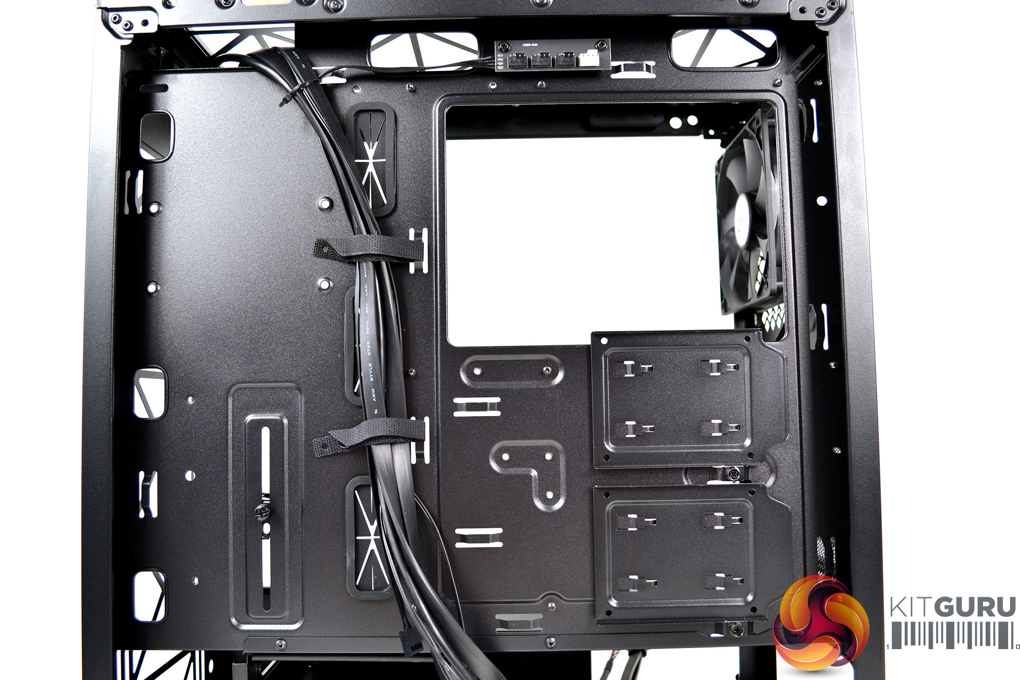 Right at the top of the motherboard tray in the right-hand compartment is the integrated fan hub with four 4-pin PWM fan headers and a single PWM cable to connect with a motherboard header. As well as a healthy 23mm cable management space behind the motherboard, there is also a generous number of eyelets to tie cables down to, so we should be able to make a neat job of cable management when installing the system.