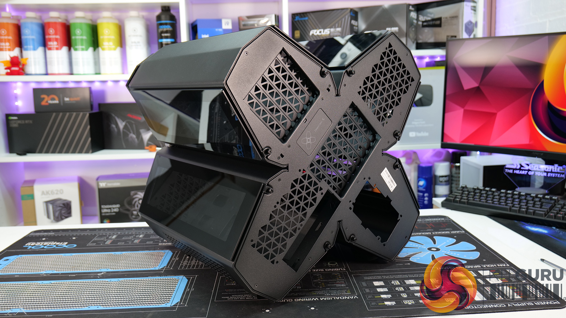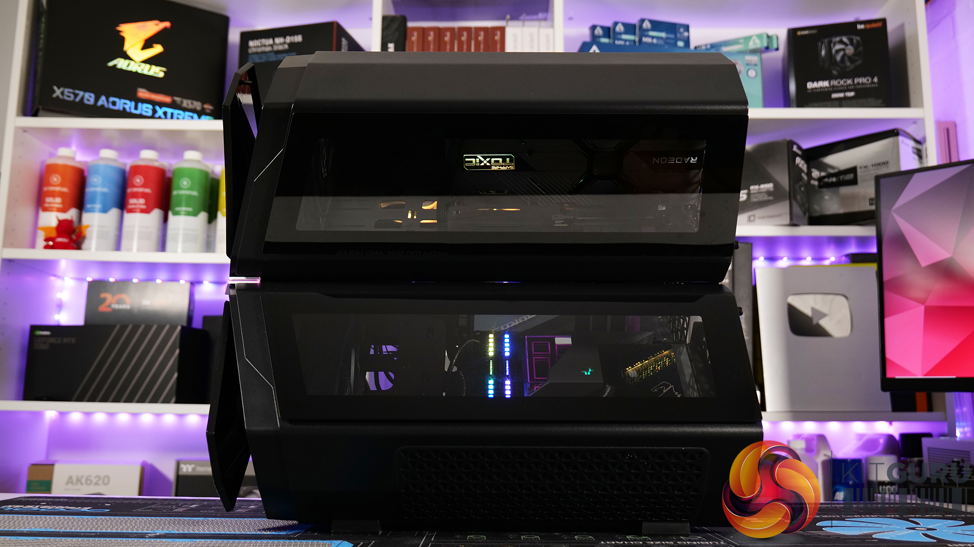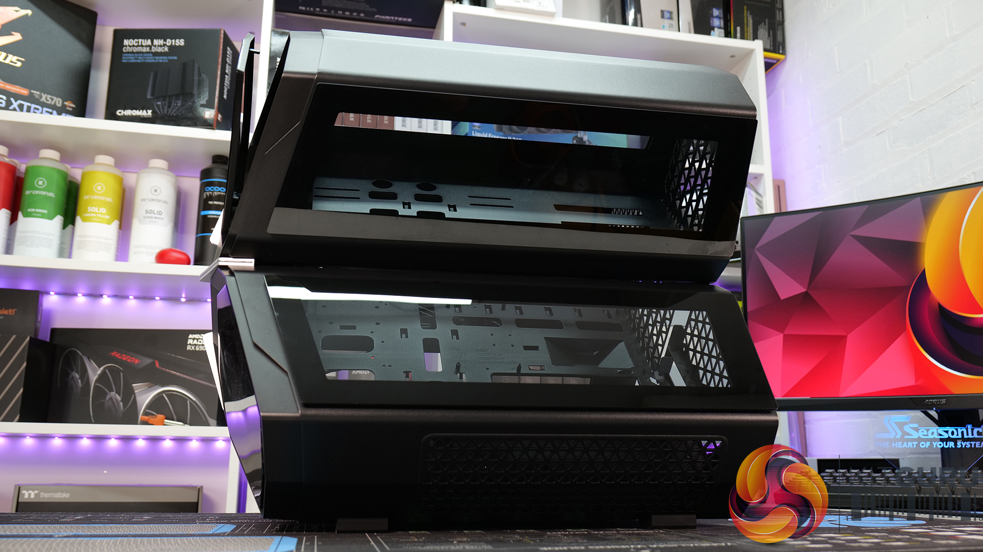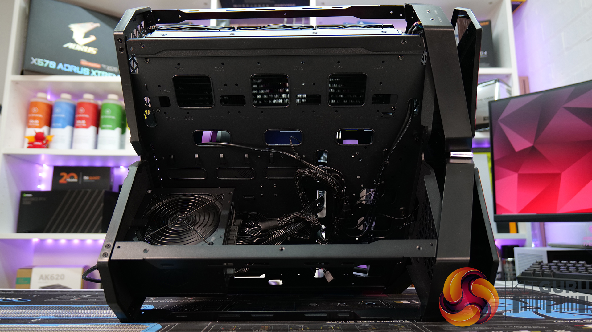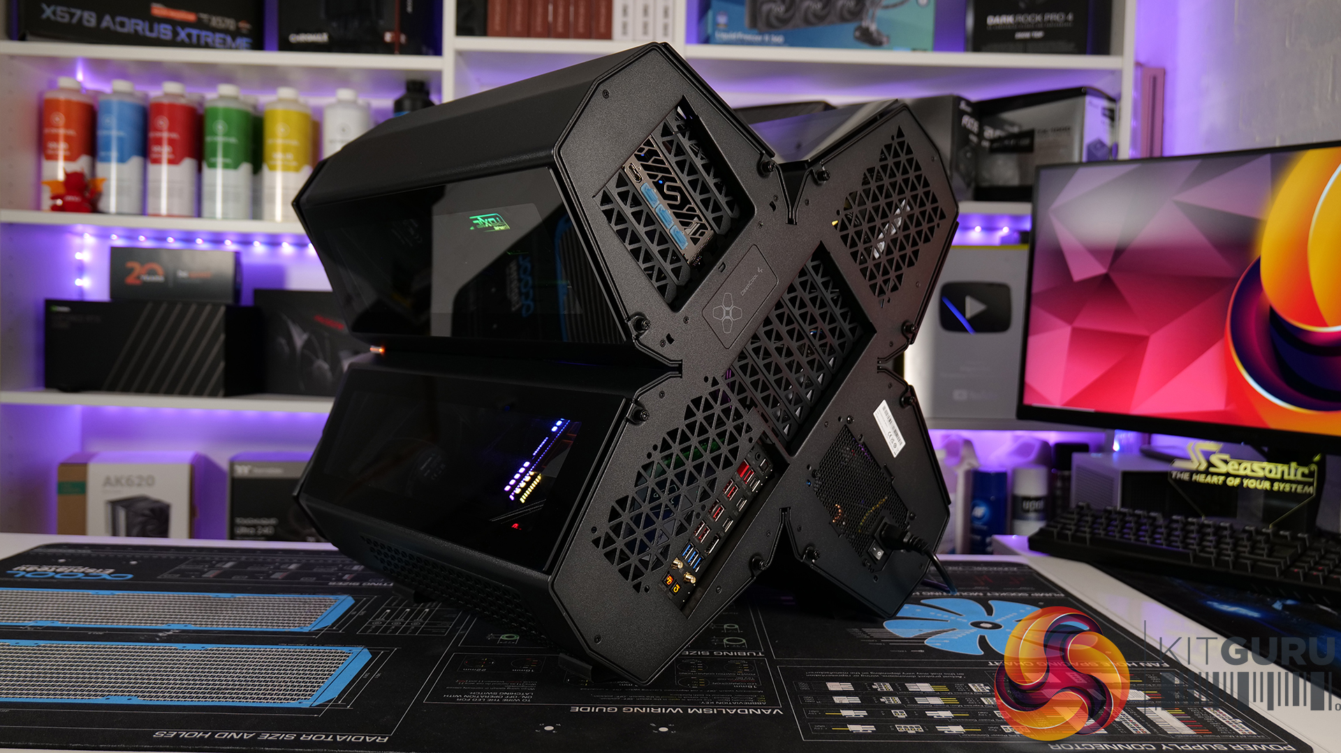 - Components can be installed inside pods splitting the motherboard, graphics card and power supply into separate compartments. Dual 360mm radiators can be mounted on removable radiator/fan brackets for easy installation.
