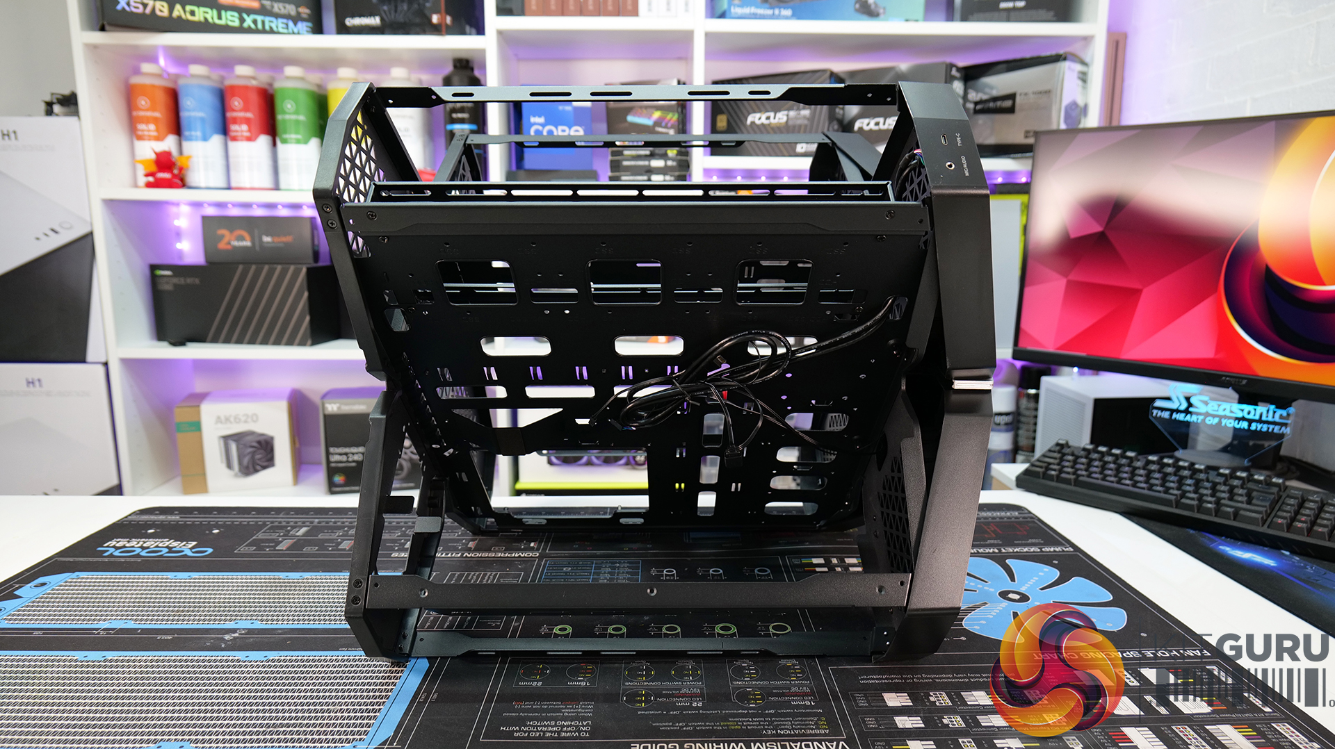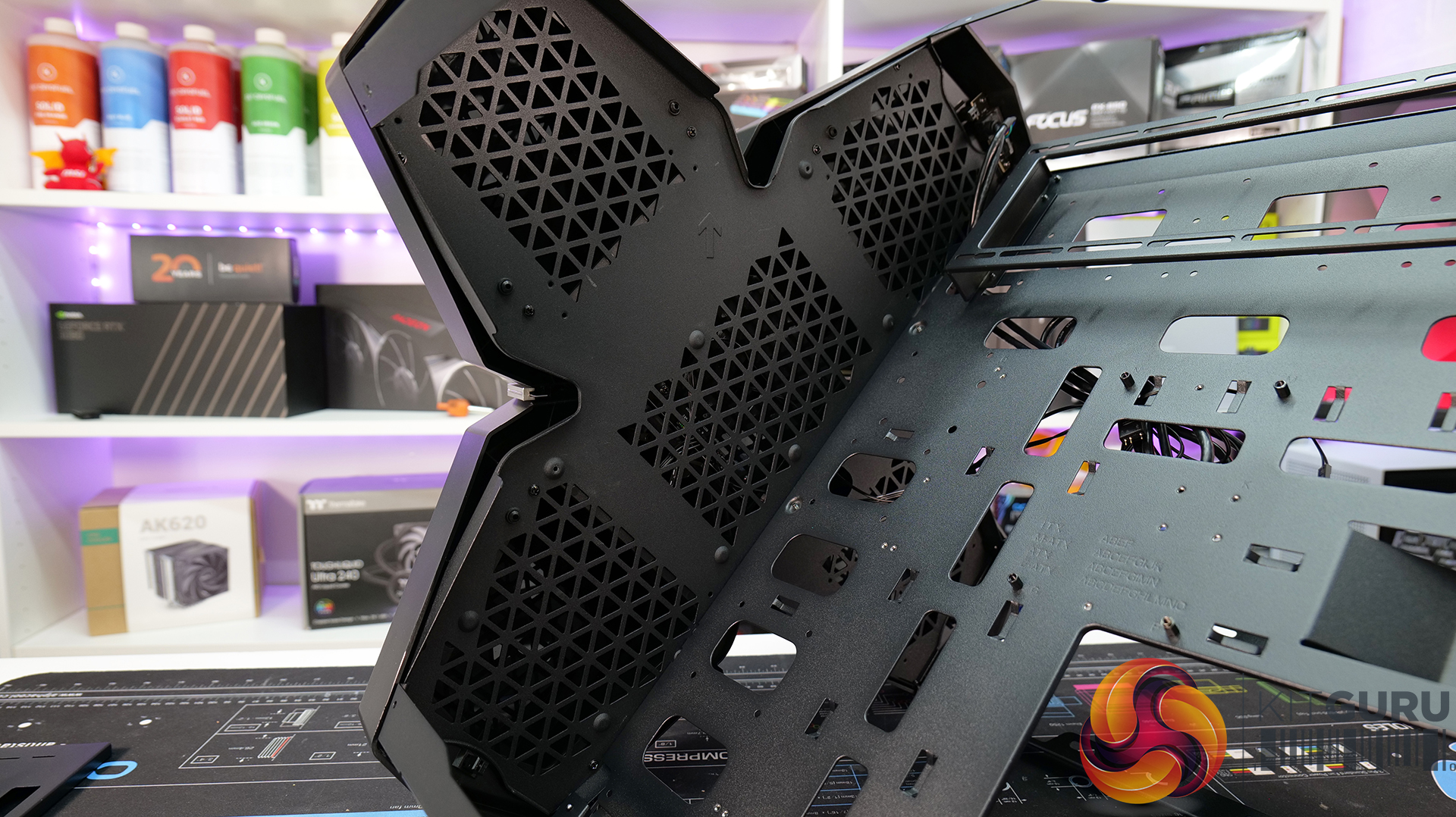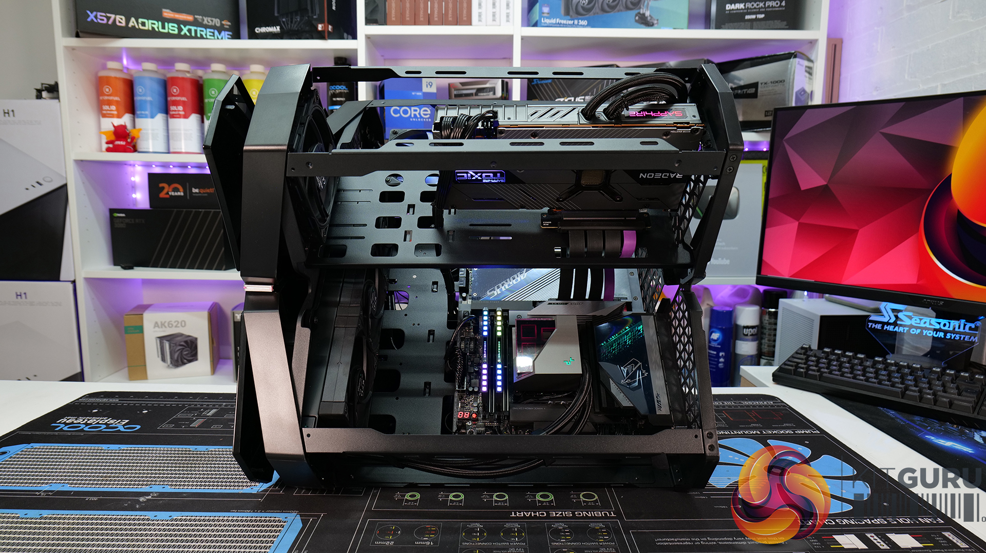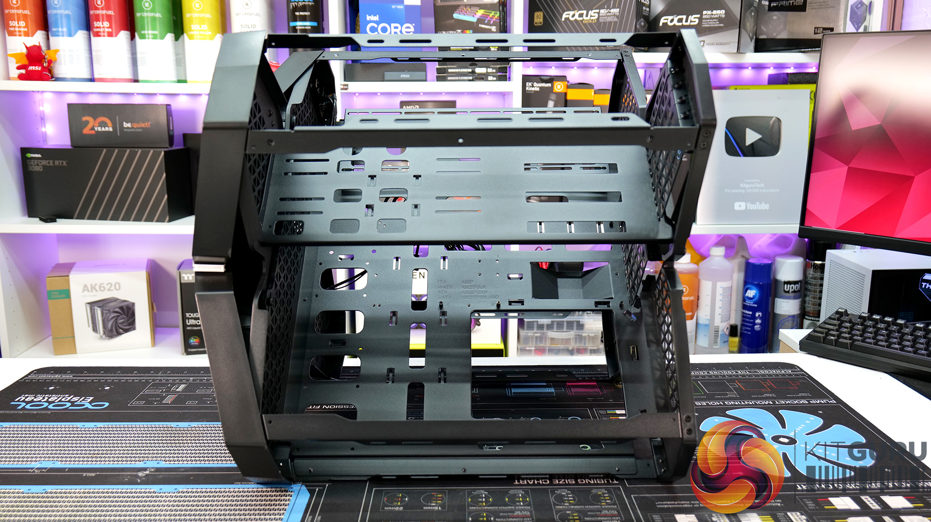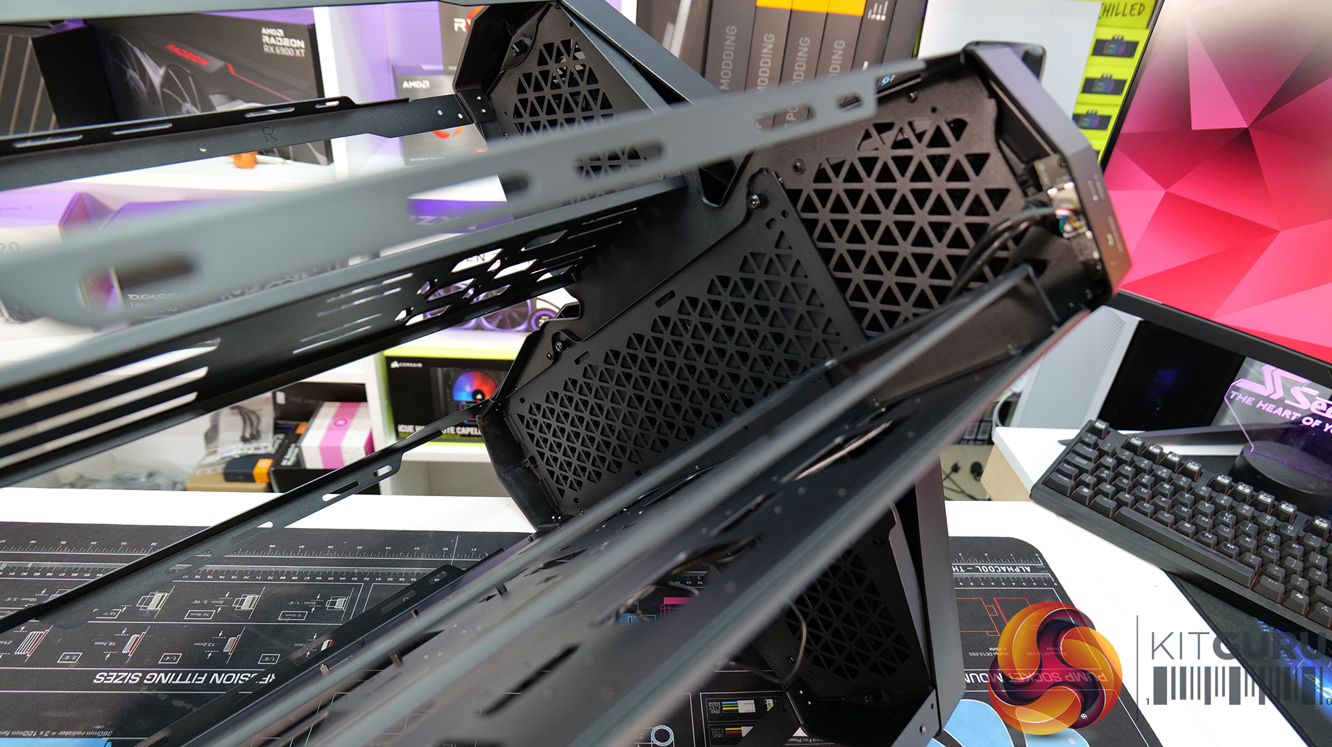 - Components can be installed inside pods splitting the motherboard, graphics card and power supply into separate compartments. Dual 360mm radiators can be mounted on removable radiator/fan brackets for easy installation.