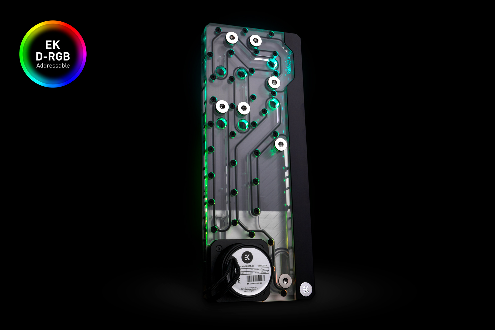EK Water Blocks has engineered the EK-Quantum Reflection Fractal ATX D5 PWM D-RGB distribution plate to be installed next to the motherboard so that it does not hinder airflow from entering the case. The distro plate also includes an addressable D-RGB lighting strip that runs the entire length of the unit with an anodised black cover hiding the LED hotspots. The RGB lighting connects to standard motherboard headers and can be controlled and configured via motherboard RGB software.