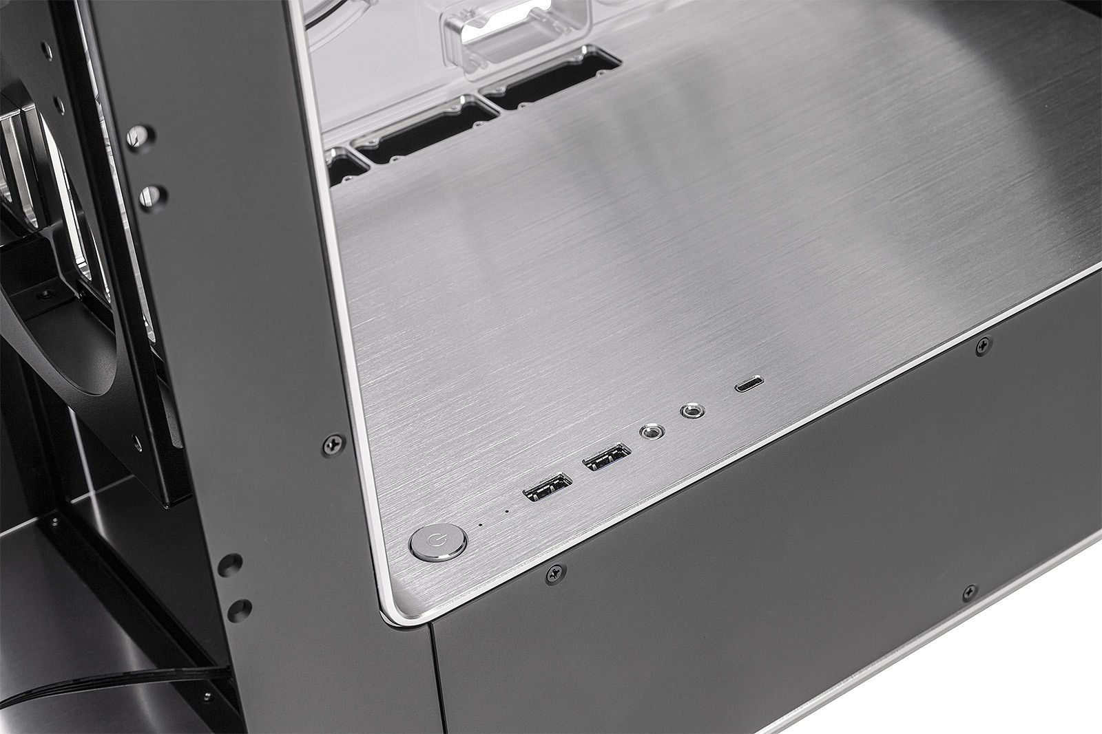 The custom distribution plate is able to house dual D5 pump setups and due to the wider design of the case, there is space to install two of EK’s 60mm thick, 480mm XE radiators and fans. EKWB claims that there is no other case on the market with these features, which makes the EK-Quantum InWin 909EK really special. On the outside is a beautifully sleek looking 4mm thick aluminium body with subtle curves and a front (side) I/O that consists of two USB Type-A ports, a single USB Type-C port and HD Audio jacks.