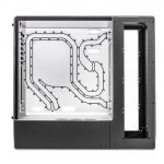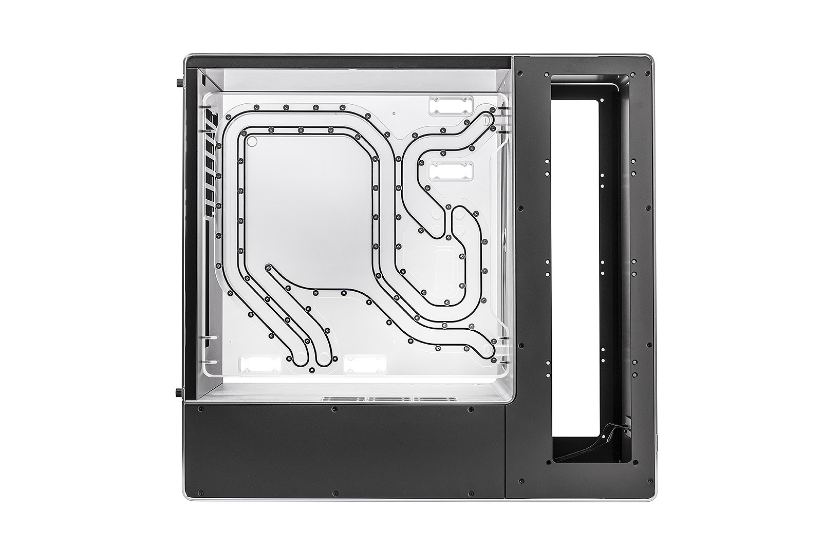 Not only does the unique “floating” motherboard tray look amazing, it also acts as a reservoir and is equipped with integrated cable routing points too. The huge water distribution plate features multiple G1/4” inlet and outlets to offer simple installation of hard tube cooling loops, where little or no bending is necessary. The generous amount of inlet/outlet ports means the EK-Quantum InWin 909EK can support up to four water-cooled graphics cards.
