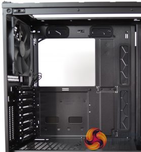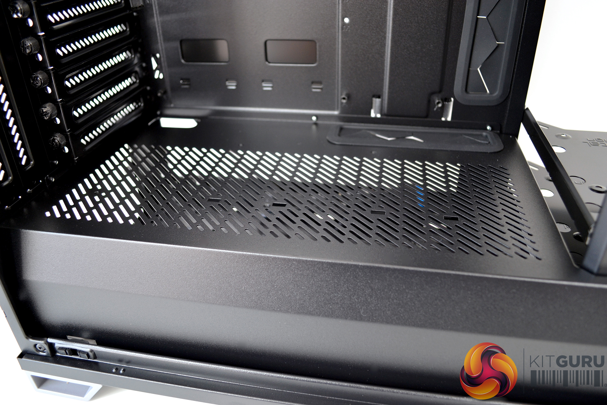 Inside the PSU shroud, there looks to be plenty of room to install a large power supply. Towards the front, there are spaces for either two 140mm fans or a 280mm radiator to be installed.