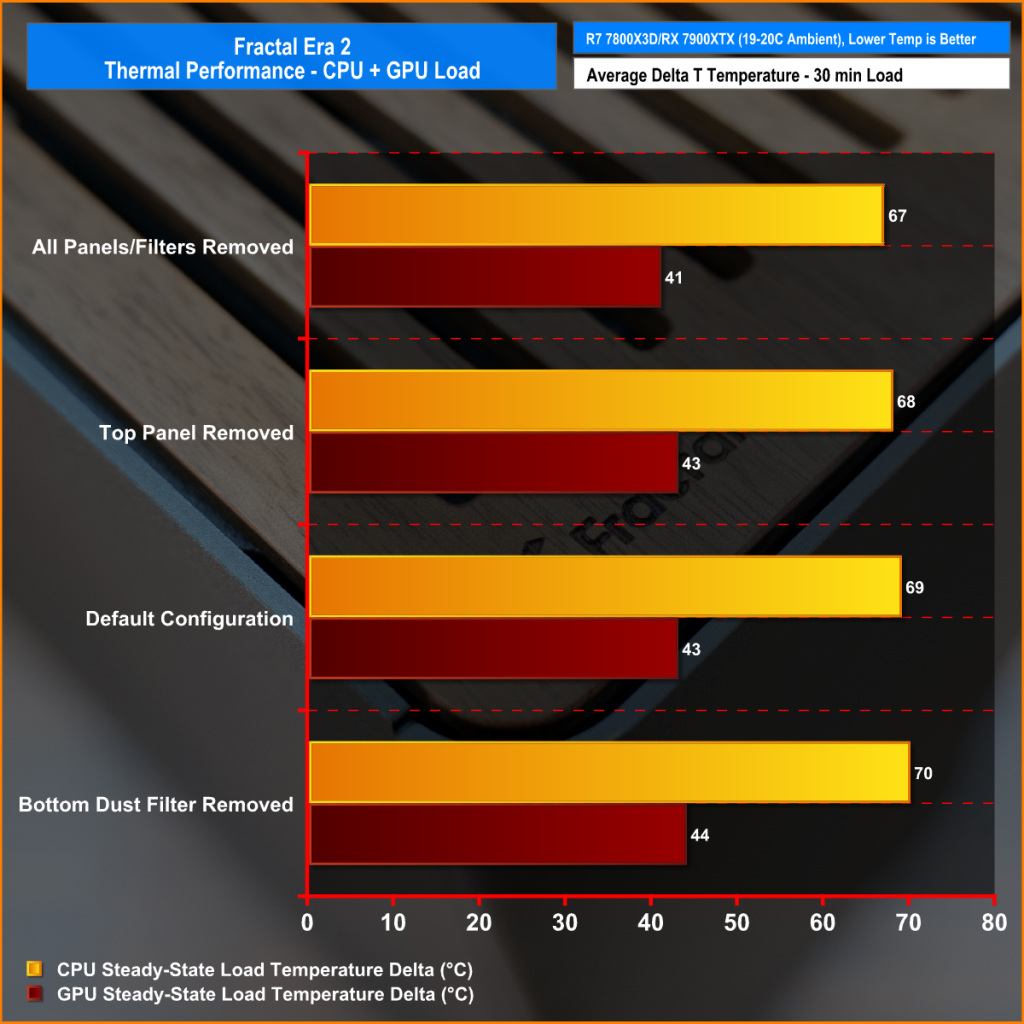 Thermal performance with the case in its default configuration with all panels installed is good. The CPU temperature average of 68°C over ambient means that it's just 9 or 10°C hotter than the 7800X3D in our launch review, but this is using a smaller radiator inside an enclosed case with GPU heat introduced.