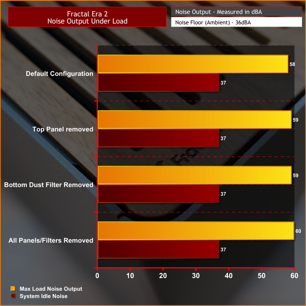 When fan speeds increased due to component temperature rising the noise output with this resonating noise hit 60dBA, which became quite distracting. At lower fan speed when the system was idle the noise dropped back to a normal reading of around 36 decibels.