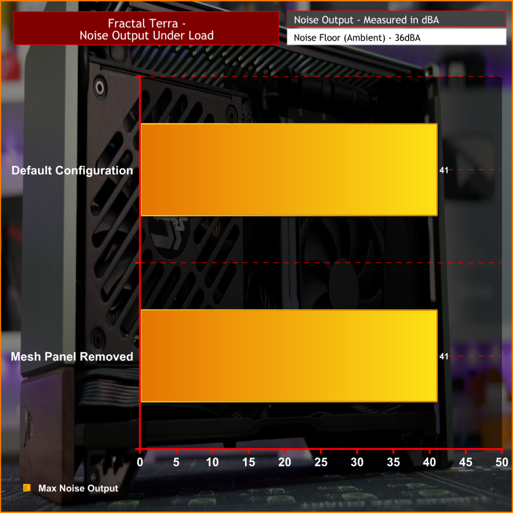 Since removing side panels makes little to no difference in thermal performance, fan speeds are neither increased nor decreased so noise levels also remain stable when changing the case configuration. Again this is a good sign that the ventilated panels are doing their job efficiently and the case is able to cool the hardware sufficiently.