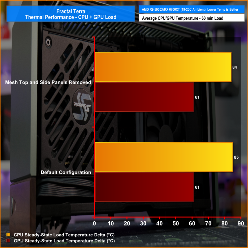 In its default configuration, the Fractal Terra produces thermal results as we would expect, the CPU temperature is a little on the high side but that’s due to the ultra-low profile CPU cooler used. The case will allow for the installation of larger coolers, but the CPU temperature is still within AMD limits.