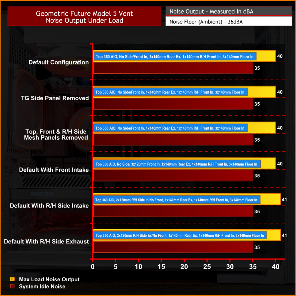 Removing the glass side panel and mesh panels also had a minor effect on the CPU and GPU temperature, proving that the mesh panels aren’t restrictive. So in its default configuration with the stock fans, the Model 5 Vent is a good choice of case for cooling high-end components.