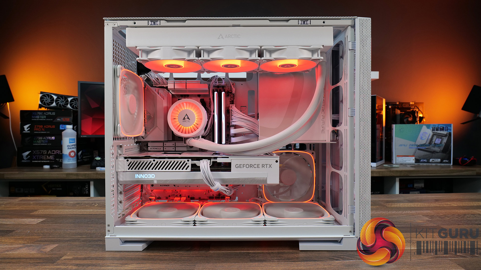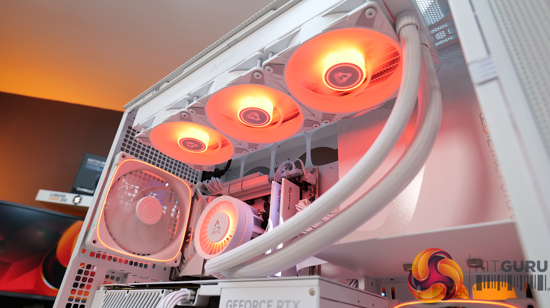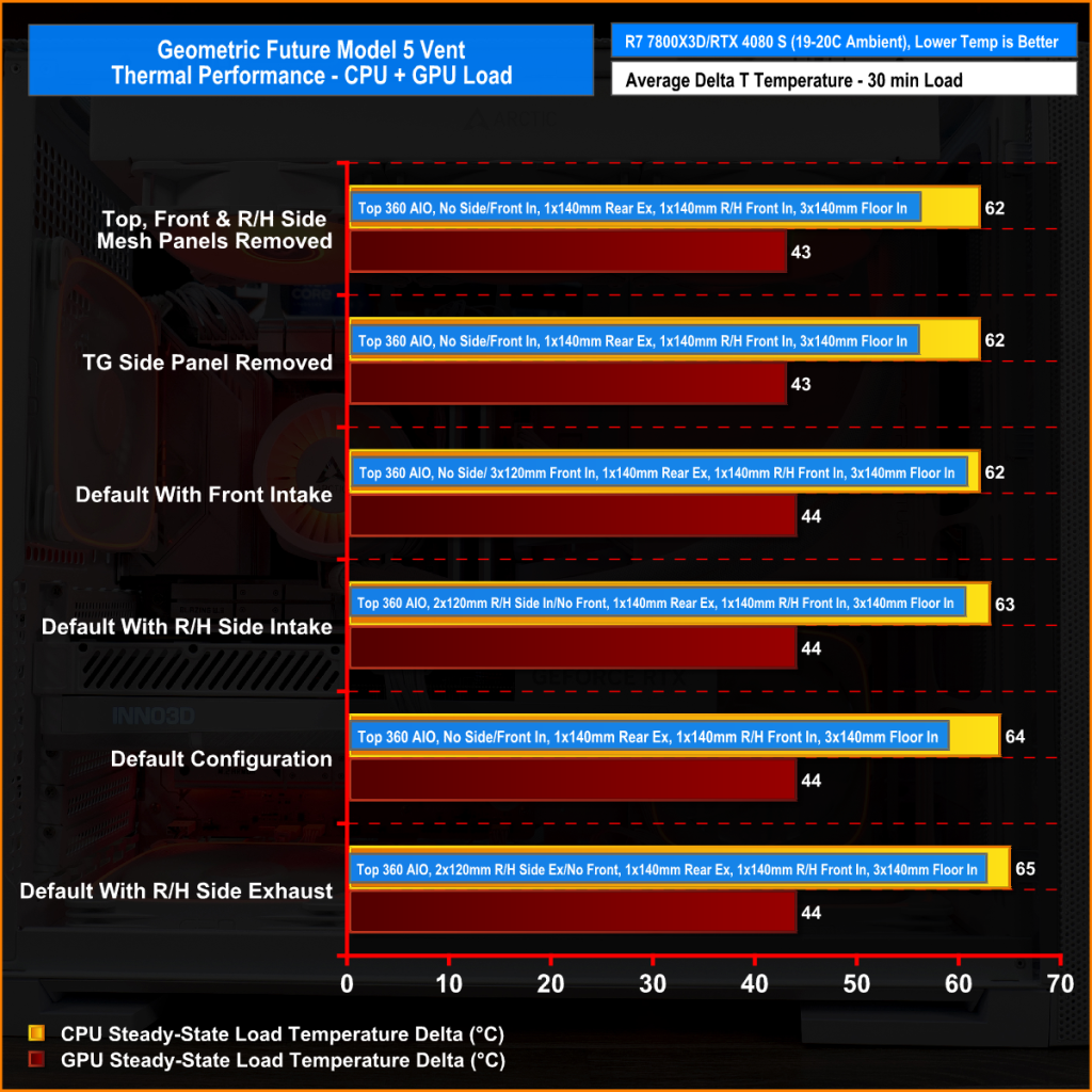 We tested the case thermals with a 360mm AIO CPU cooler installed in the roof and with the case in several different configurations. The default configuration shown in the charts is with a 360mm roof-mounted AIO, the stock case fans installed and all case panels fitted.