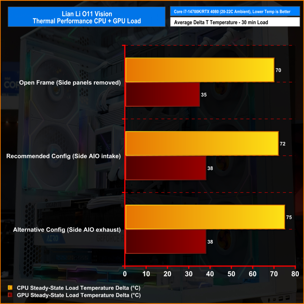 Removing side panels dropped both the CPU and GPU temperatures by a few degrees. However, the alternative AIO configuration with exhaust fans negatively impacted CPU thermals, so the recommended Lian Li configuration has proved to be the best.