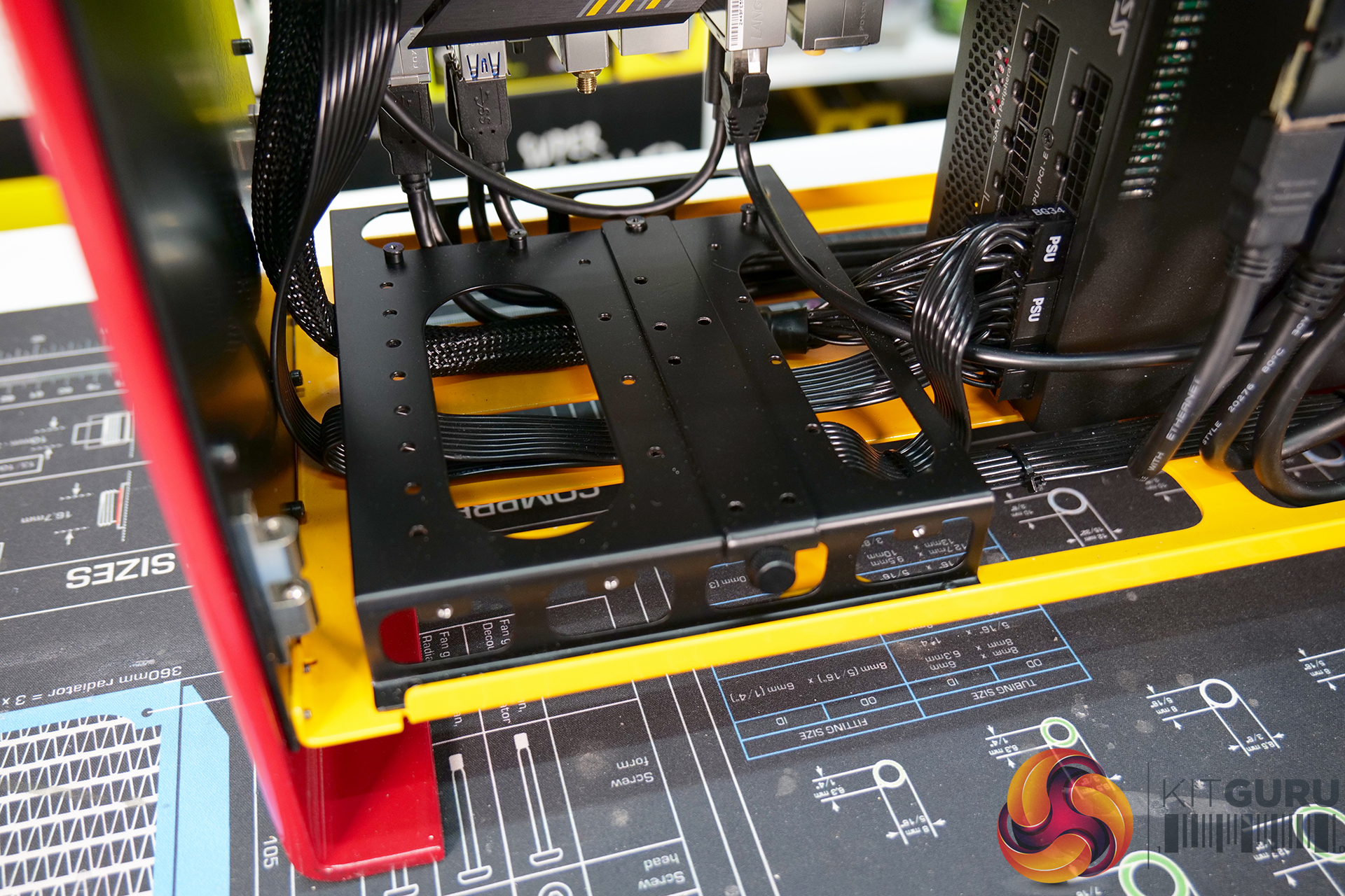 - On the floor of the chassis is a HDD caddy where the user can install up to four 3.5-inch or 2.5 inch HDD/SSD drives in a vertical orientation.