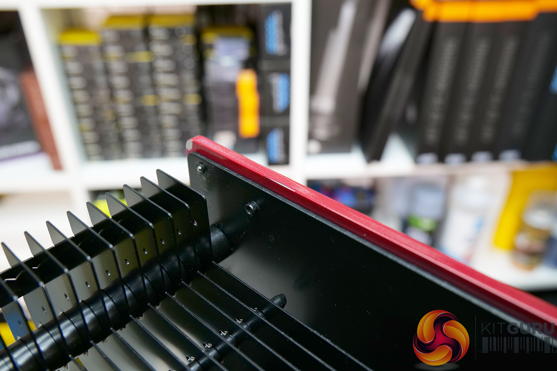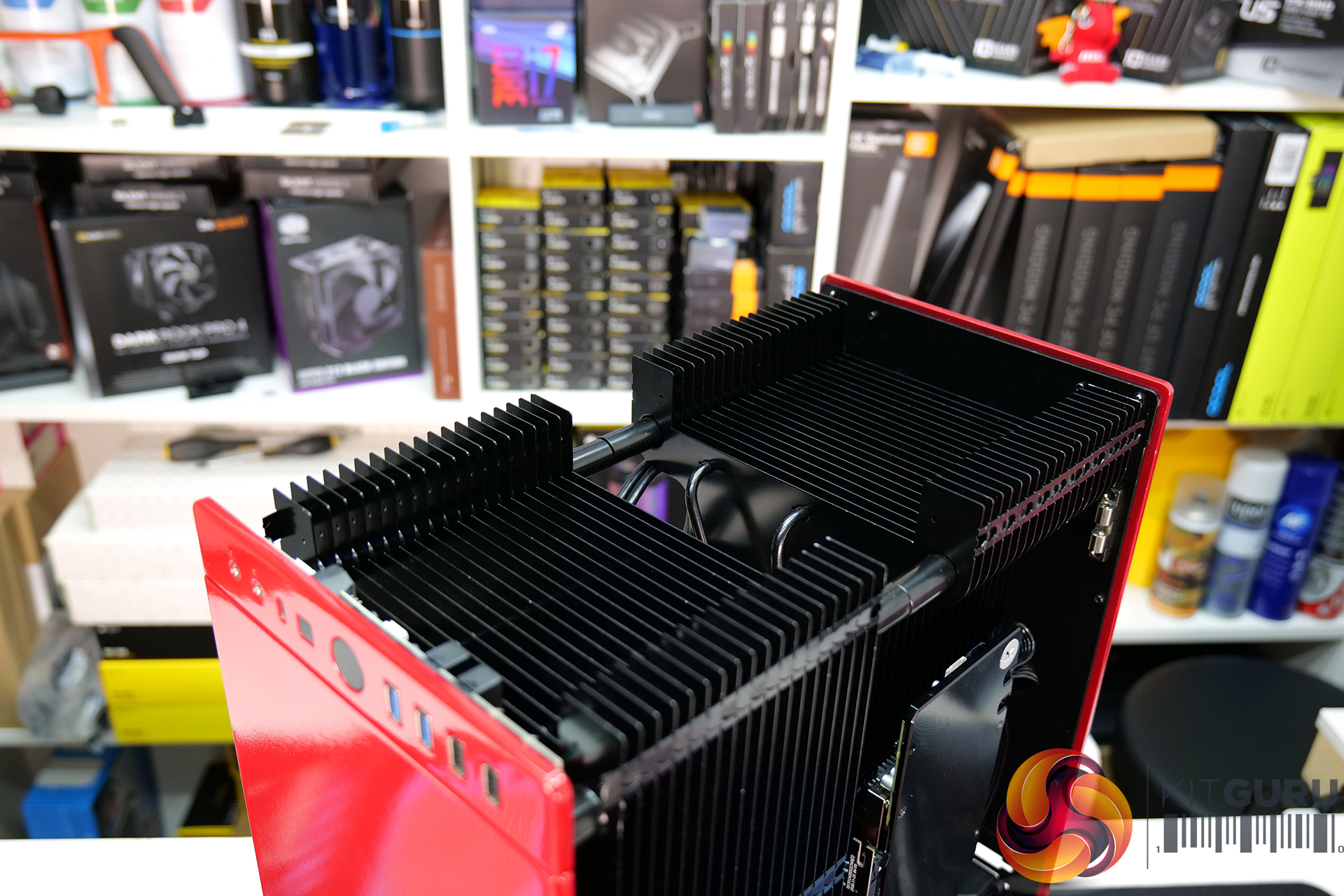 Inside The Beast are two giant heatsinks with ten 6mm heat pipes each, equipped with twenty large aluminium fins on the GPU side, one less on the CPU. The fins are spaced wider than you would expect from a normal CPU heatsink as this wider spacing is more suited to the airflow from the natural convection. Running through and connecting the heatsinks to the aluminium chassis panels are two large copper thermal drains that help spread the heat to the case.