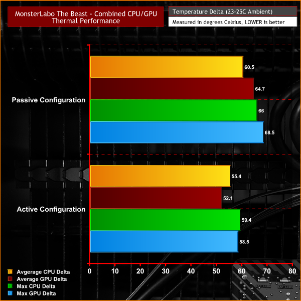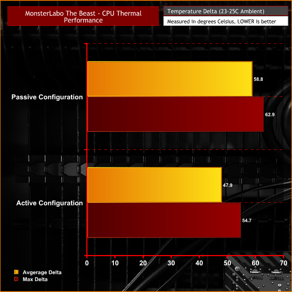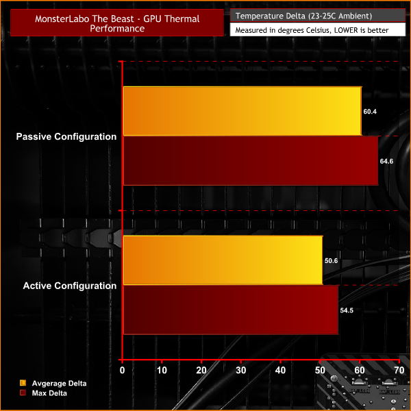 The effect of running The Beast in active or assisted airflow mode is also tested by running the same tests again with two 140mm EK Vardar fans placed in the fan mounting locations at the top of the chassis. The fans are set to run at a constant 650RPM which means that the system is still almost silent and below the 36dBA noise floor in the test room.