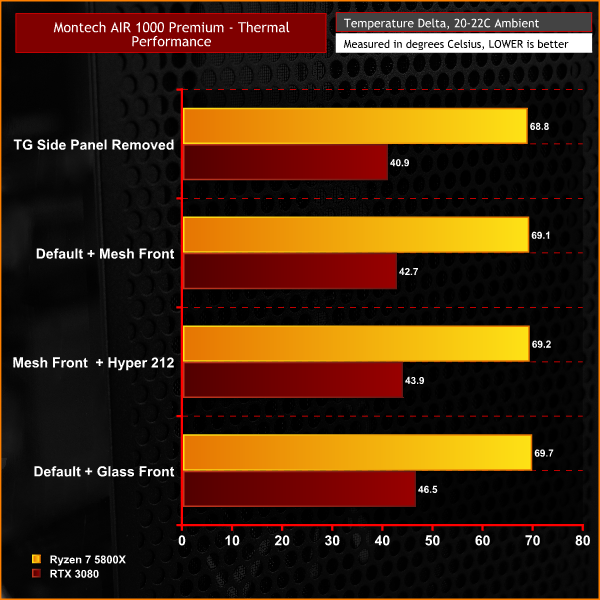With this in mind, we can see from the chart above that using the case in any configuration (high airflow mesh or with the tempered glass front installed) CPU and GPU temperature can be kept under control. If a bigger air cooler or AIO is used, we expect thermal performance to be very good in this chassis. But even using a smaller air cooler, a high-performance CPU such as the AMD Ryzen 7 5800X runs within spec temperature.