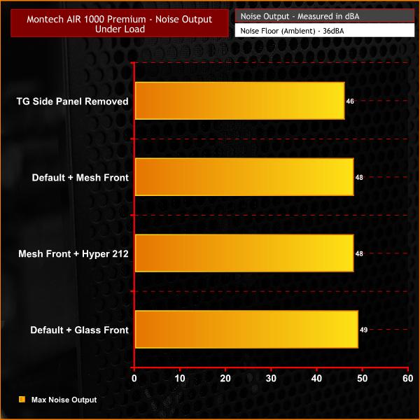 Noise levels are measured by placing a noise meter 300mm from the front of the chassis while the stress test is running and the peak noise level during the test is recorded. The noise floor (ambient noise level) in the room is 36dBA.