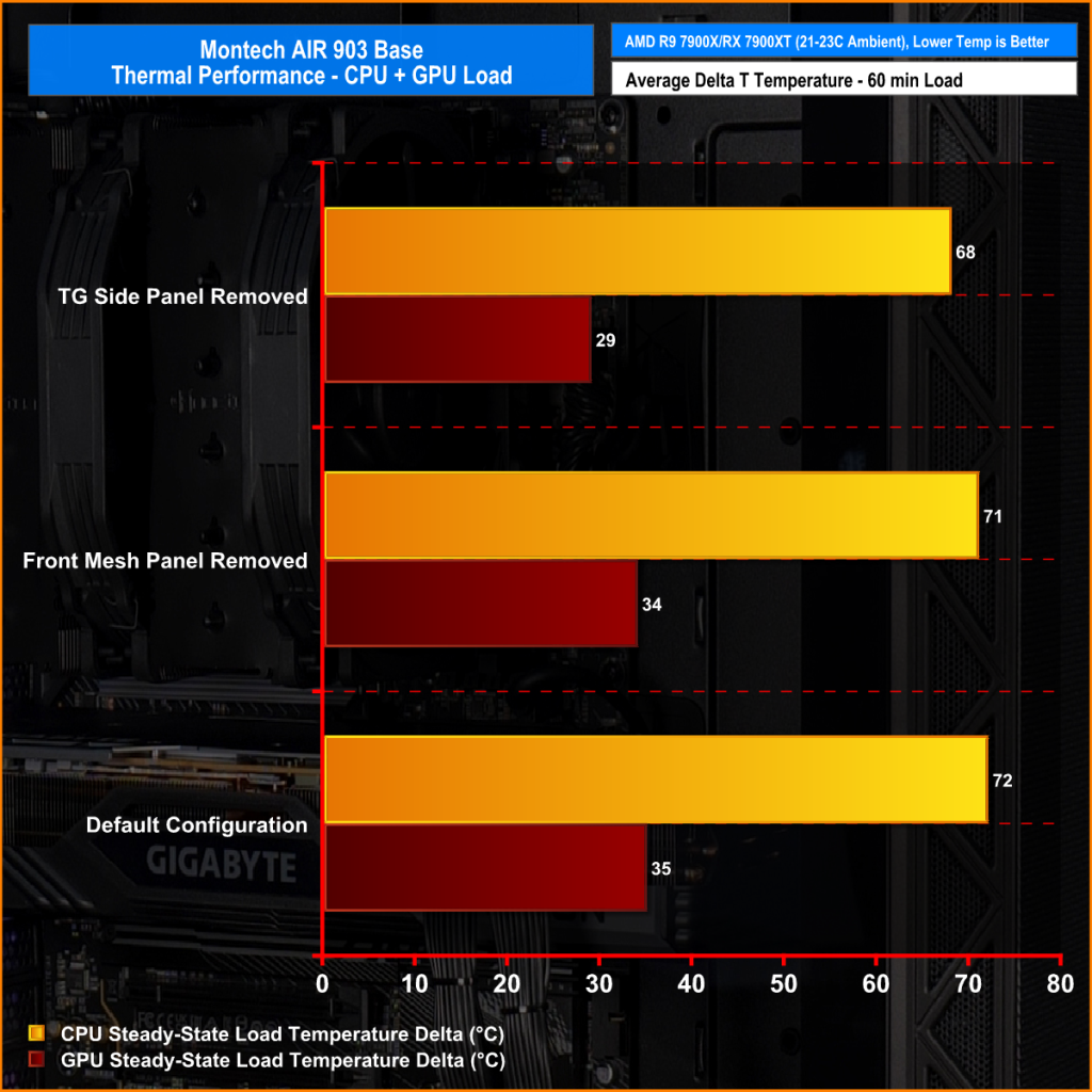 Thermal performance is measured with the case in various configurations, such as the default, with the tempered glass left-hand side panel removed and with the front panel removed to see how these configurations affect the CPU and GPU temperature. During testing, only stock case fans are used unless otherwise specified. All water pumps are set to maximum RPM and fans are set to a custom RPM curve by the Motherboard software/BIOS.