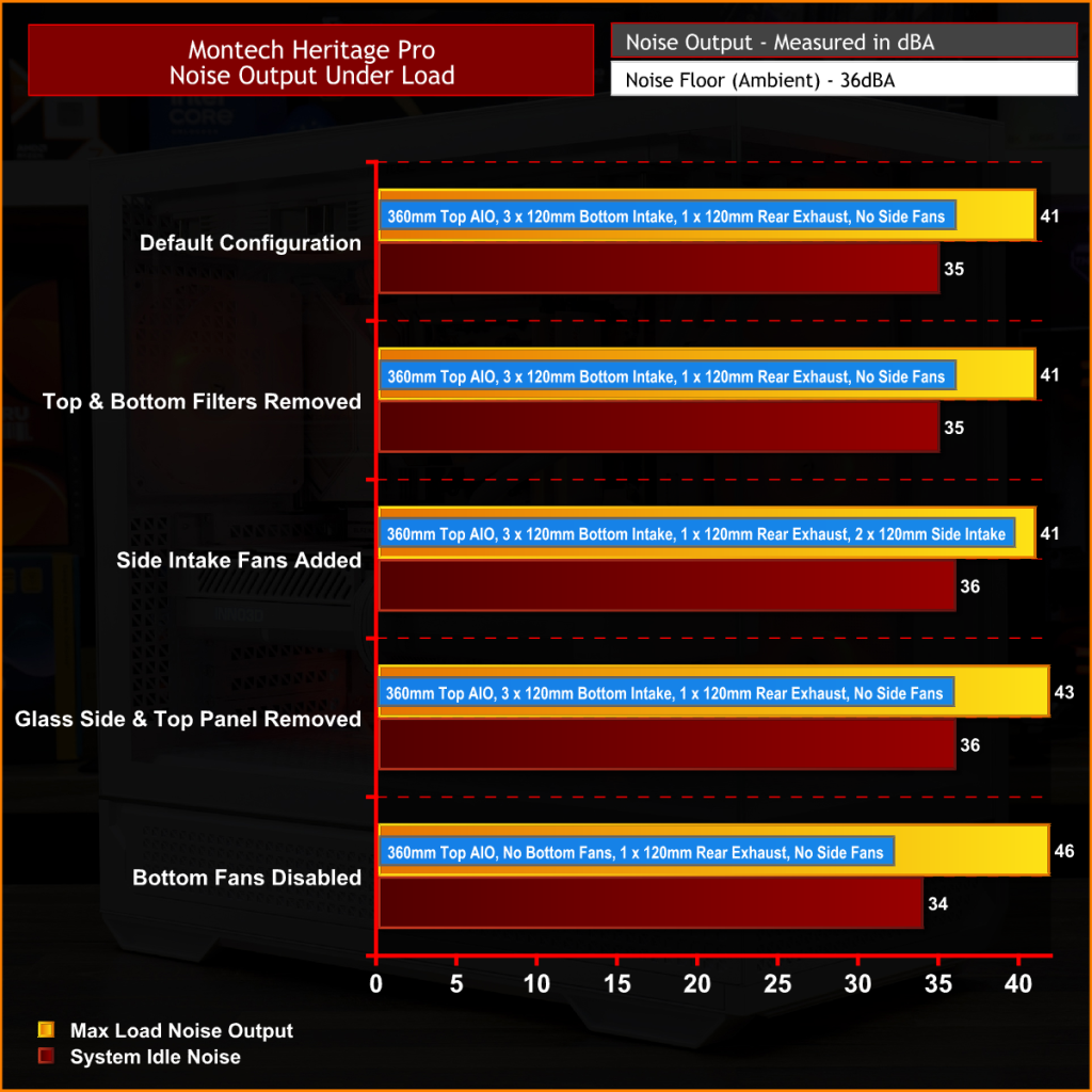 The stock fans that come with the Montech Heritage Pro are not the quietest. To get the fans running at an acceptable noise level at idle the fan speed had to be reduced to around 850RPM. But under load the AIO fans have to work quite hard to keep CPU temperature cool so the noise output of the system under load is quite loud in certain configurations.