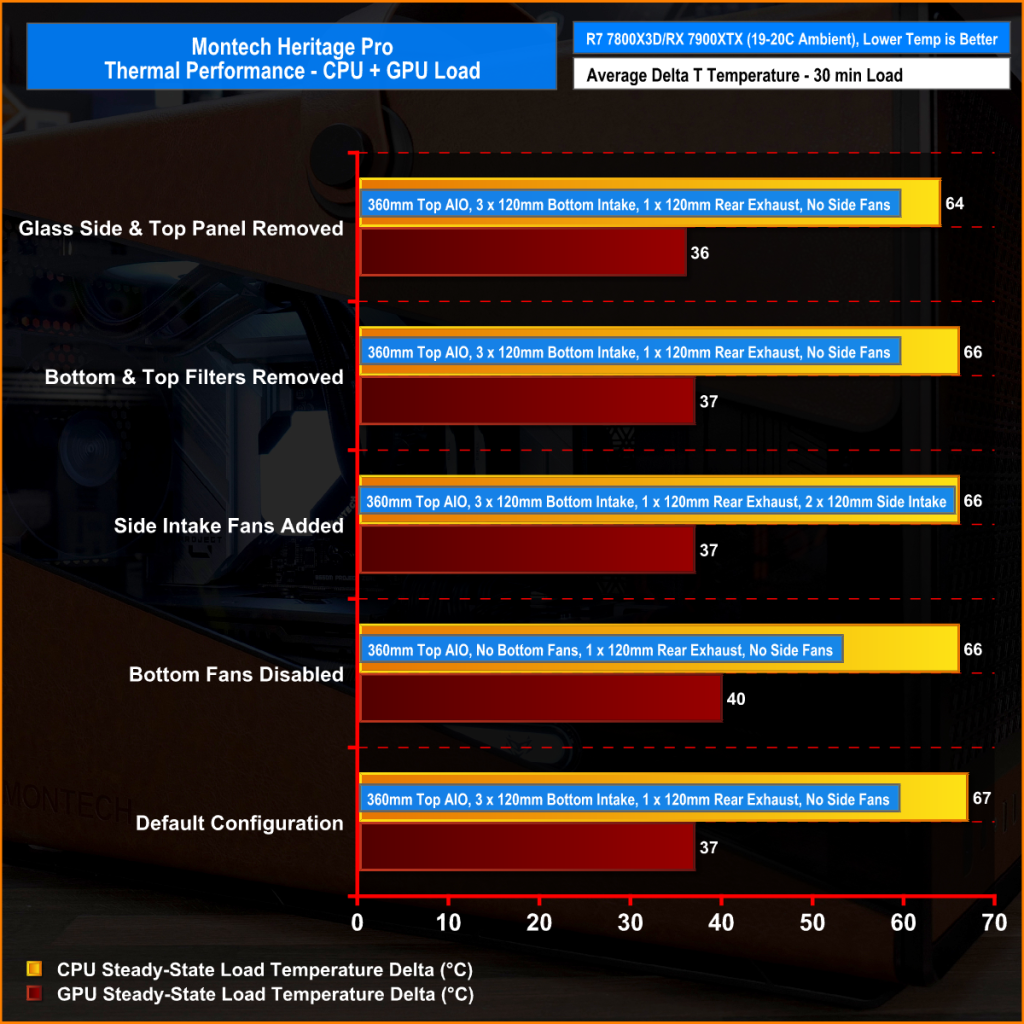 For a compact Micro ATX case the Montech Heritage Pro does OK when it comes to thermal performance. In the default configuration, CPU load temperature averages 67°C over ambient while the GPU sits comfortably 37°C over ambient, which is normal for this CPU and GPU combination even in larger ATX size cases.