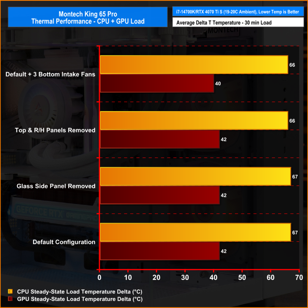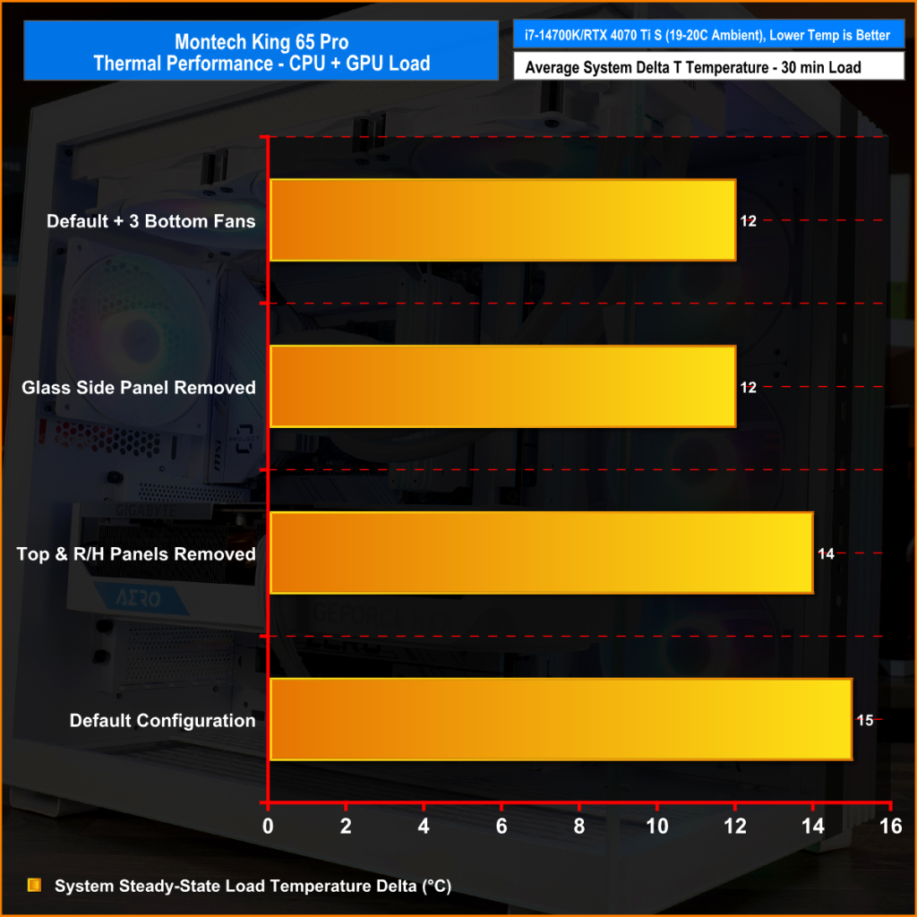 Good performance is shown again in the system temperature chart where the default case configuration produces a system temperature of just 15°C over ambient under load. Again, removing panels has little effect on system temperature, but there is a 3°C drop in system temperature with the bottom intake fans installed, so this might be worthwhile but only if you have some extra cash to spend on additional fans.