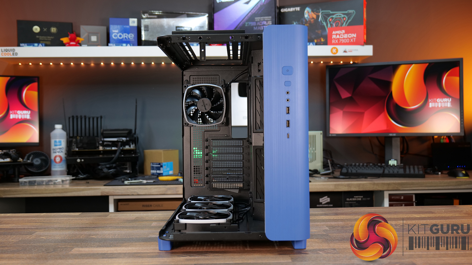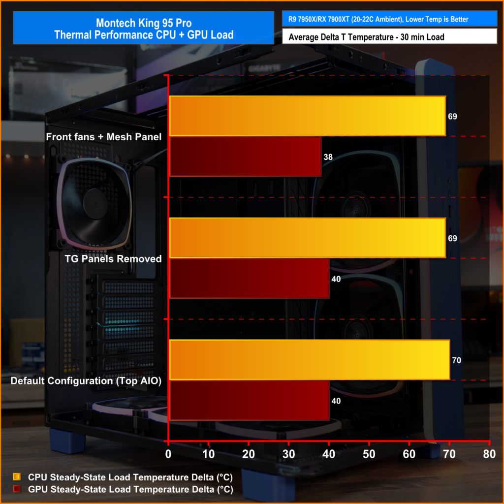 With the case in its default configuration with all glass panels installed and the fans in the stock locations the case does an excellent job of keeping both the CPU and GPU temperature under control. An average CPU temperature of around 70°C is normal for a dual chamber chassis with the 7950X and the GPU core temperature sat happily at an average delta temperature of 40°C which is ideal.