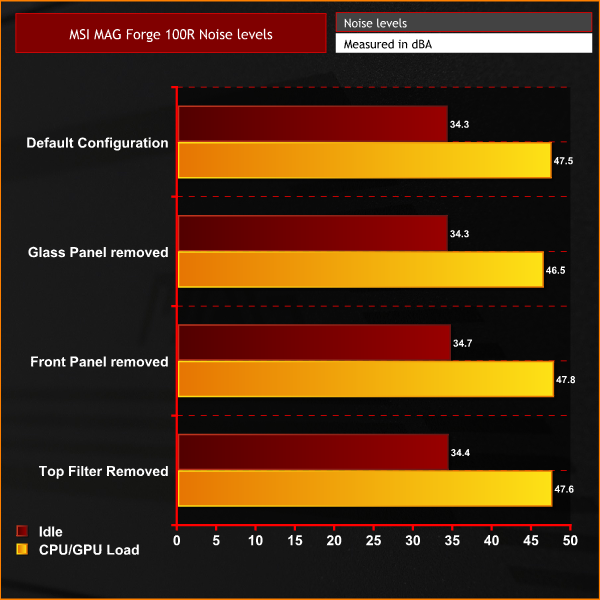 Since the Forge 100R is equipped with this open mesh front panel, noise levels follow a similar pattern to thermal performance. Whether the case is in its default configuration, or with panels removed the noise levels remained consistent, so there is no real benefit of changing the configuration of the case from its default setup.