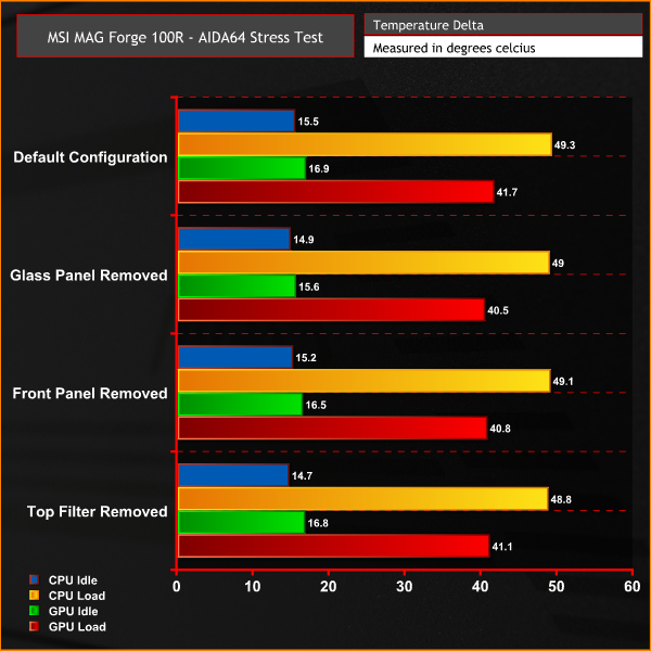 During our thermal performance tests with the Forge 100R in several different configurations, both the CPU and GPU temperature remained very consistent. Removing panels had no real impact on system temperature so with the MAG Forge 100R in its stock form, airflow is excellent.