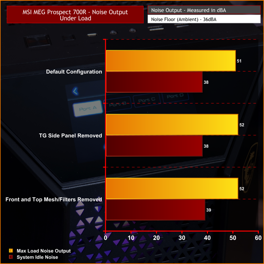 Removing the side panel didn’t have much of an impact on either the CPU or GPU temperature but removing the top and front mesh dropped CPU temperature by a few degrees. However this was most likely due to the removal of the top dust filter which can be restrictive and isn’t needed when running the radiator at the top with fans set as exhaust. Overall thermal performance is good in either scenario.