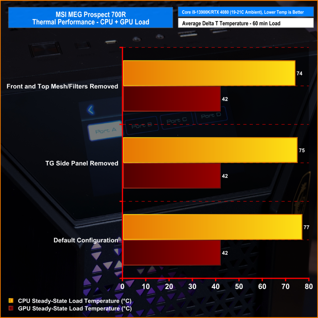 With the system under full load, the MSI MEG Prospect 700R copes well with thermal demand. 77 °C delta is normal for the Core i9-13900K CPU and the GPU temperature at 42°C delta is great for the RTX 4080, which means the airflow is working well through the case.