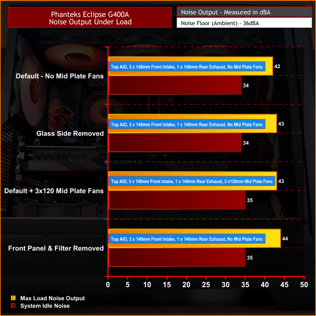 The noise output of the G400A is at its lowest with the case in its default configuration with no mid-plate fans installed. There is a minor increase in noise by adding three mid-plate fans and when removing the side panel and front panel. But overall the system runs quietly as the excellent cooling means the GPU fans are always running at a relatively low speed keeping noise down.