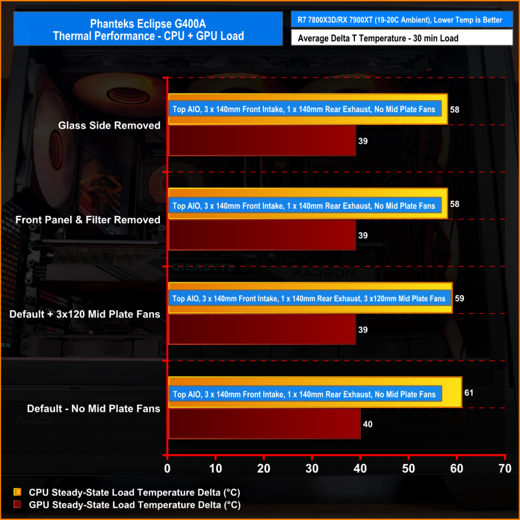 With the G400A in its default configuration without any mid-plate fans installed, both the CPU and GPU thermals are as expected for this hardware configuration at 61°C and 40°C over ambient, respectively, so the default configuration is working OK without any mid-plate intake fans. Adding three 120mm intake fans to the mid-plate lowers CPU temperature by 2°C but GPU temperature is the same.