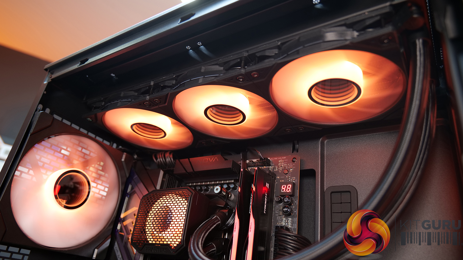We tested the case thermals with a 360mm AIO CPU cooler installed in the roof and with the case in several different configurations. The default configuration shown in the charts is with a 360mm roof-mounted AIO, the stock case fans installed and all case panels fitted.