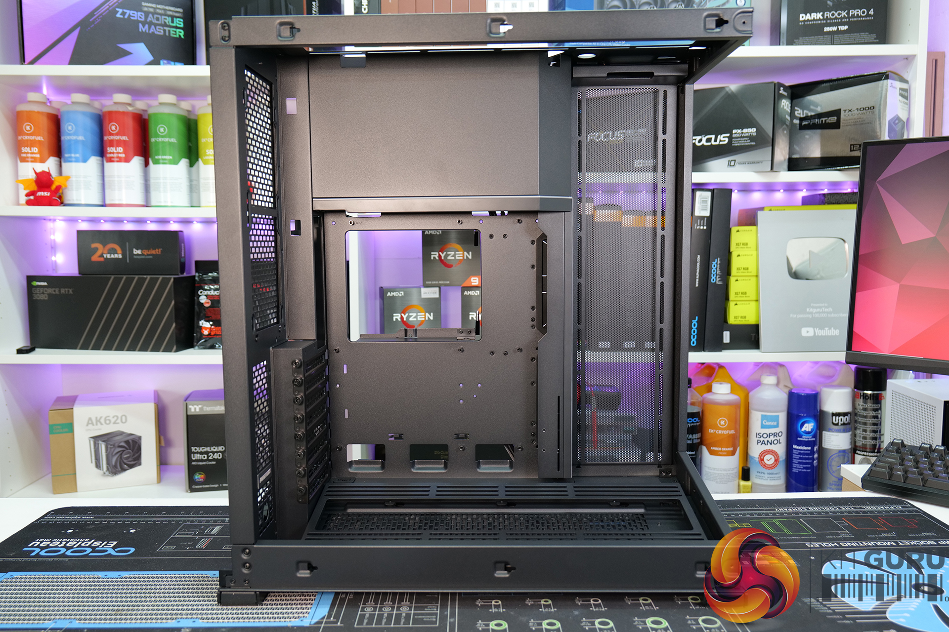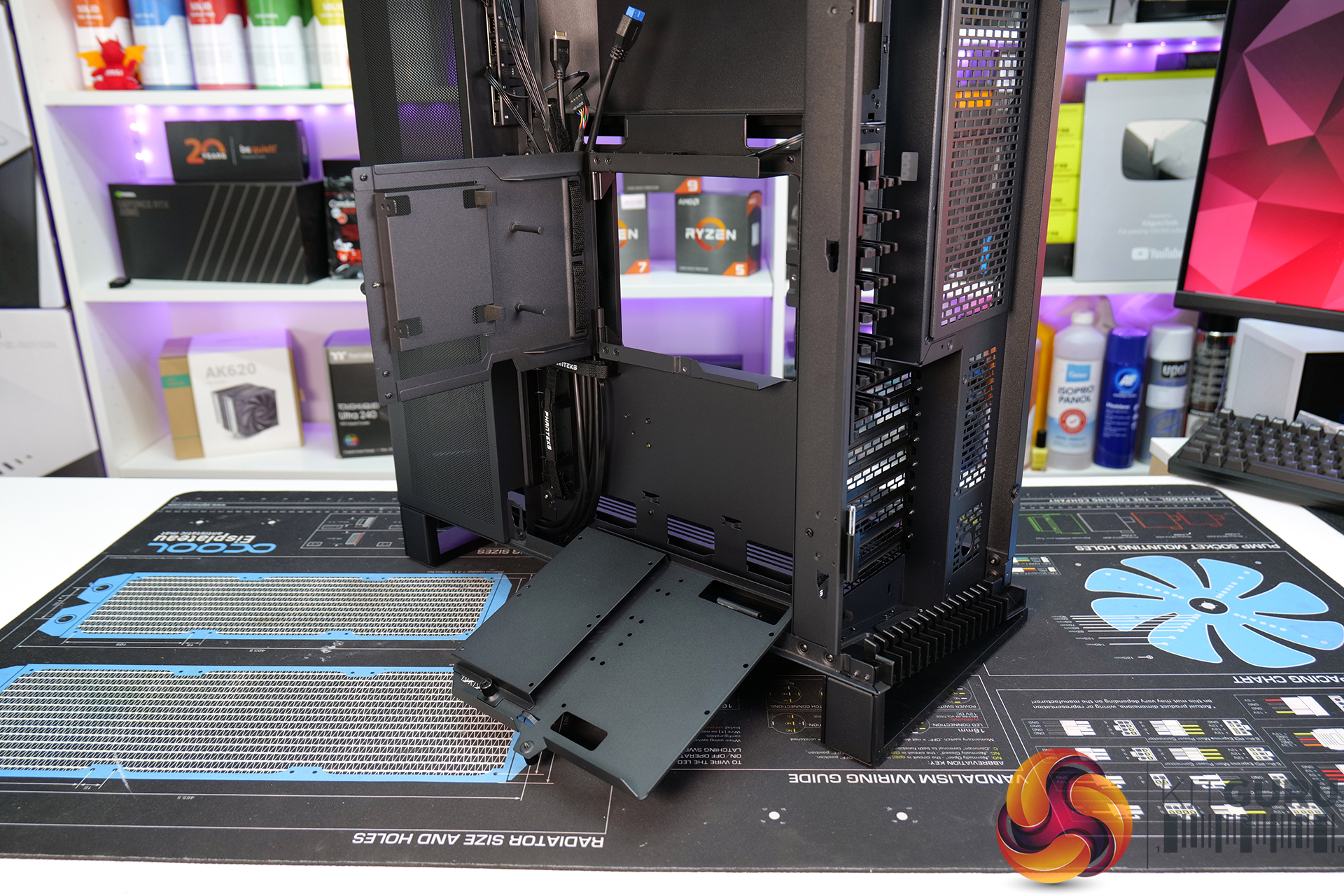 - Airflow enters the system from the bottom with a rotatable fan mount for direct GPU cooling. Mesh top and side panels create free-flowing openings for additional intake/exhaust fans.