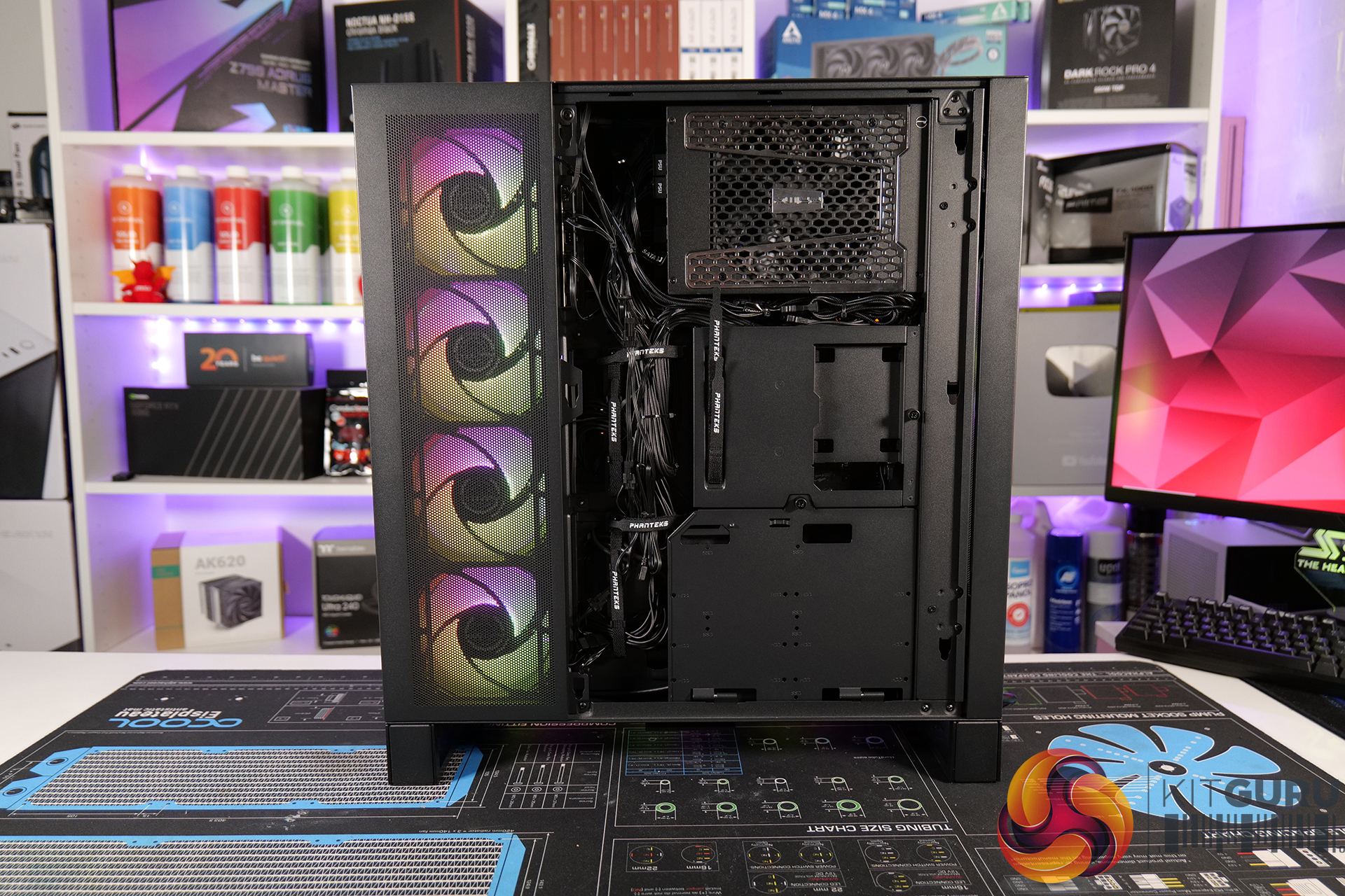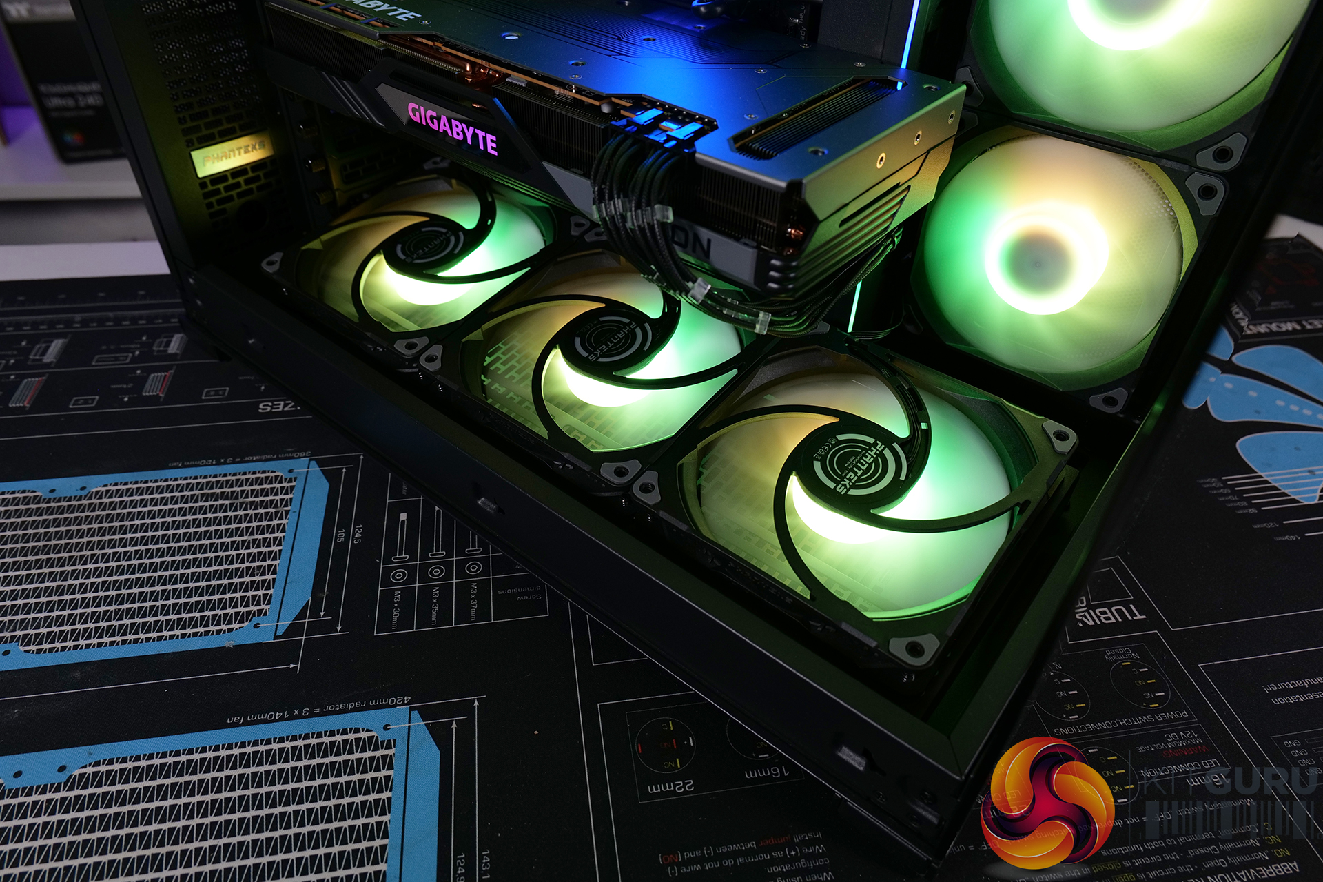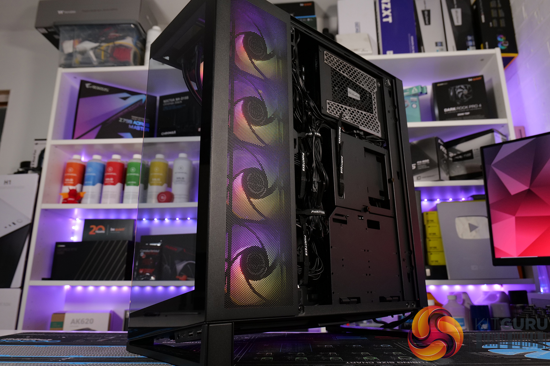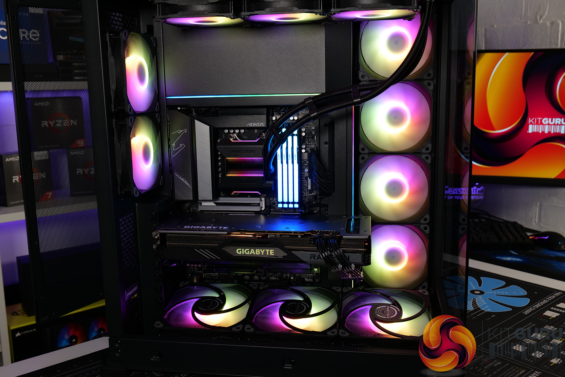 With this bottom airflow configuration and a closed tempered glass front, thermal performance is up to scratch, if anything the GPU temperature seems better than in a conventional-style ATX case which is great news. But we did add 12 fans to the system, including three 140mm fans blowing directly up at the GPU so it’s not a huge surprise that the system ran cool under load.
