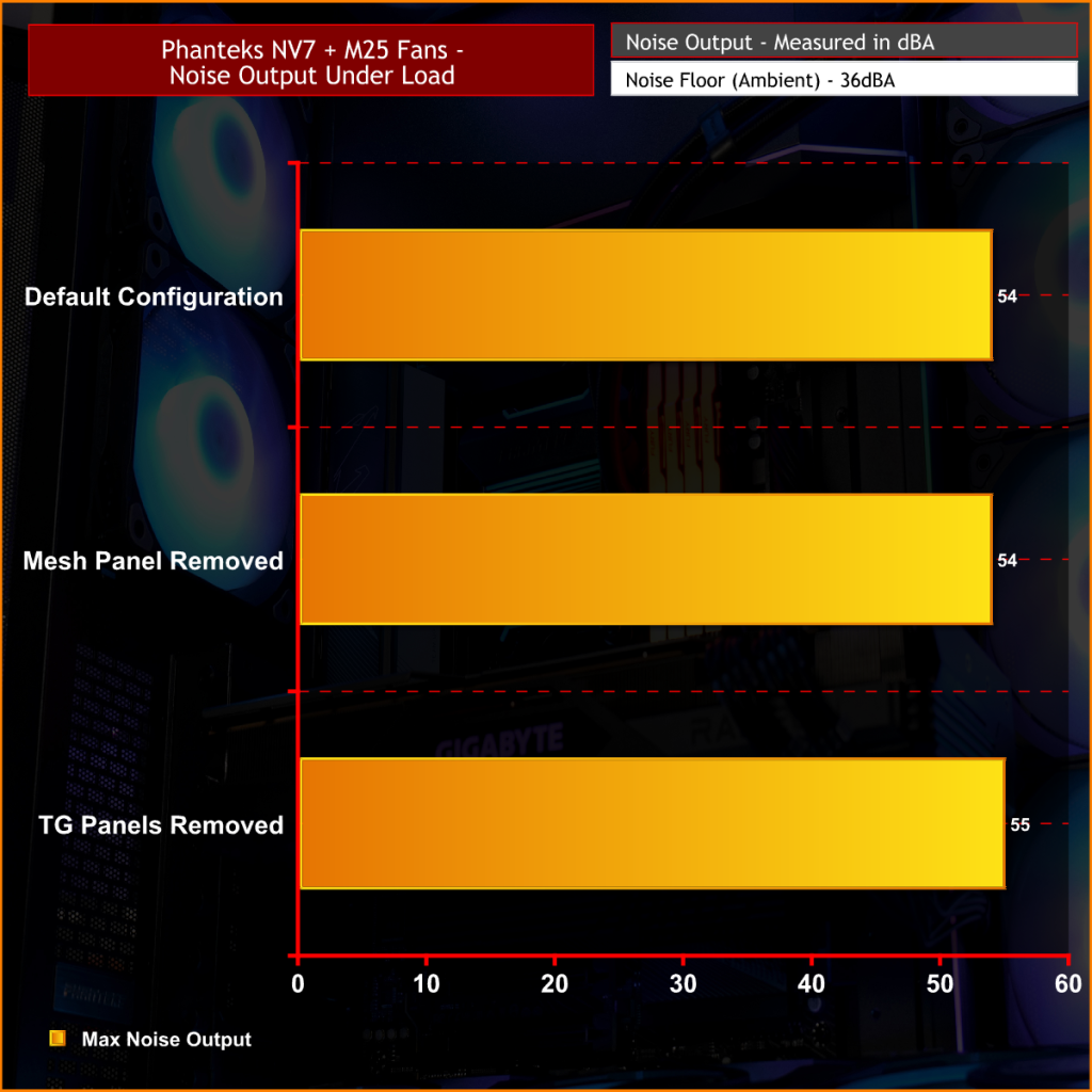 With 12 fans in a case, it's always going to make some noise. When the CPU temperature ramped up so did the fan RPM which increased noise output significantly. At 54dBA this was noticeable and could be distracting for some users. Removing panels had little effect on noise levels so the case isn't dampening noise much at all with panels installed.