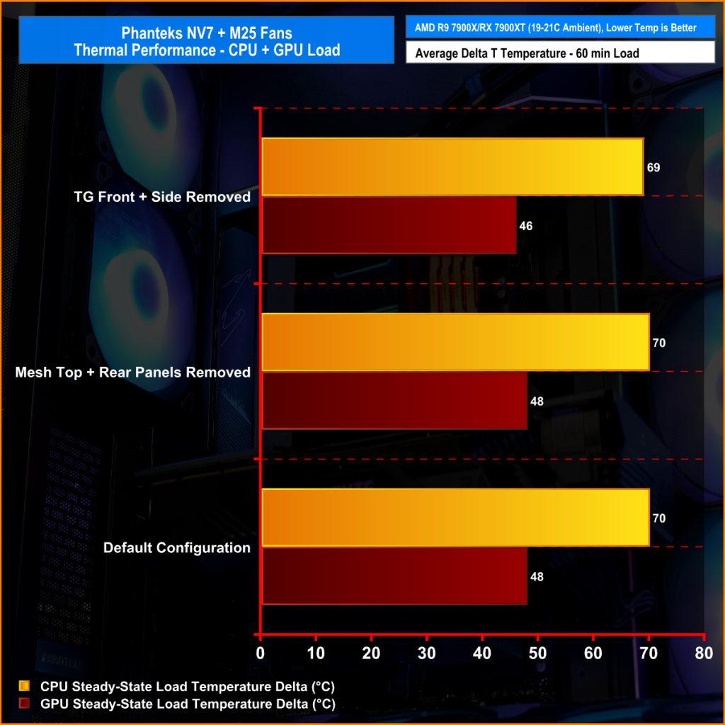 In the default configuration both the CPU and GPU temperatures were as we would expect. If anything, the 7900XT GPU ran a little cooler than normal, which is great. Removing panels had no significant effect on temperatures so it looks like airflow is good by default.