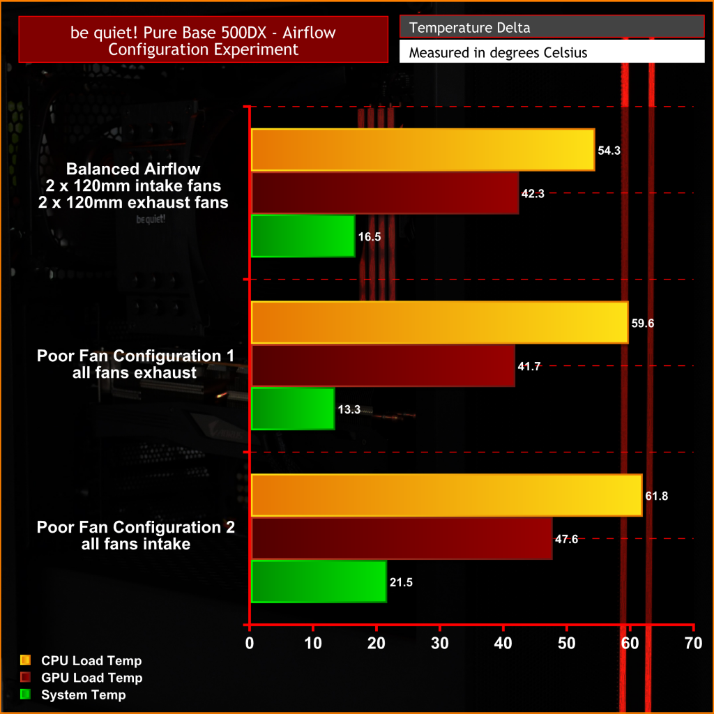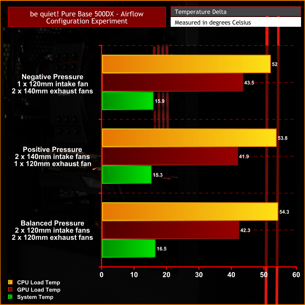 We then compared the data from the balanced pressure configuration and tested against two poor fan setups that a novice PC builder could unknowingly configure their system in, to see how much this affects the component temperatures inside the system.