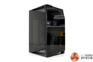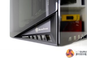 The side of the case which is technically the front has a SilverStone logo printed in a light gold colour with angular vents at the top and bottom of the chassis to allow cool air to be pulled into the system via the internal 120mm fan.