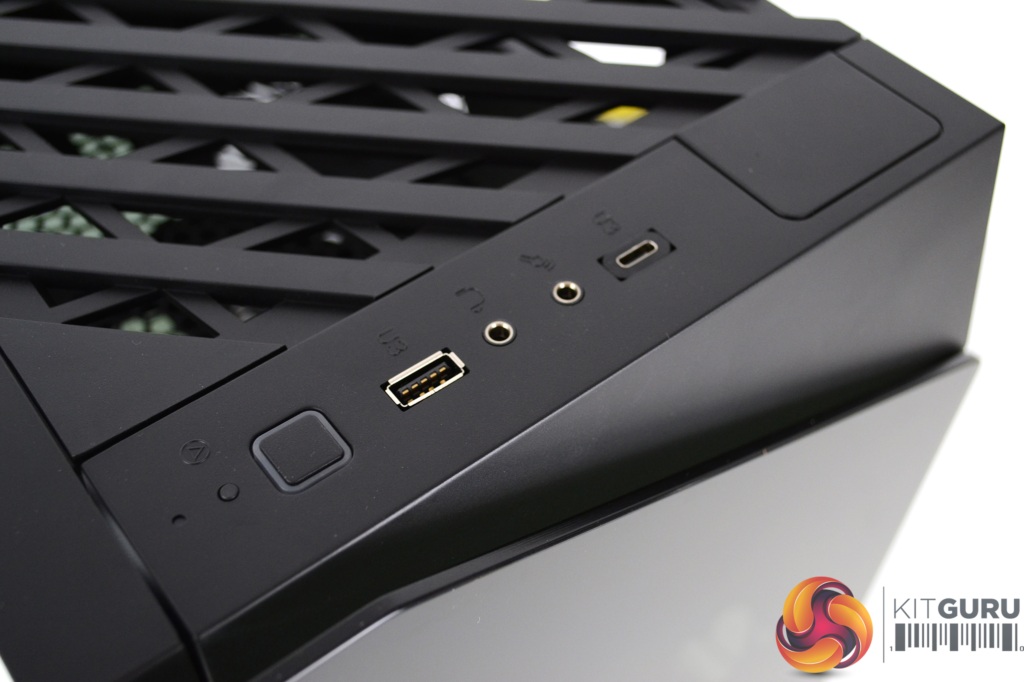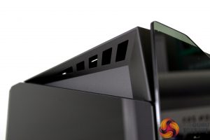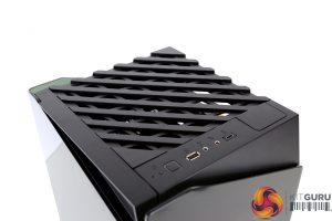 At the top of the case is a large exhaust vent to help expel warm air from the system via a 120mm pre-installed fan. Also, along the edge of the top panel is the front I/O, or top I/O in this case. The front I/O consists of just a single USB 3.0 Type-A port, one USB Type-C port, 3.5mm audio jacks for headphones and a microphone as well as a power button with power LED, reset button and HDD activity LED.