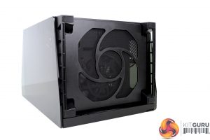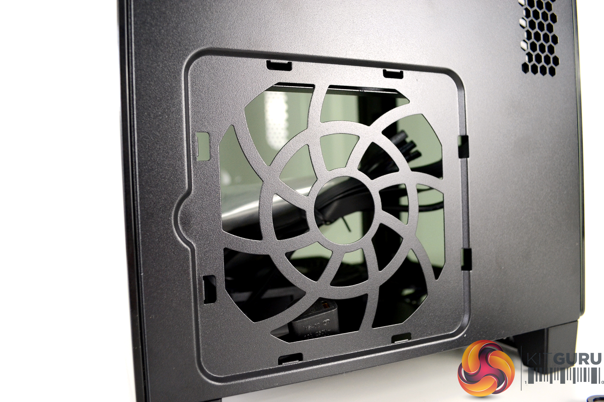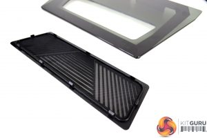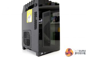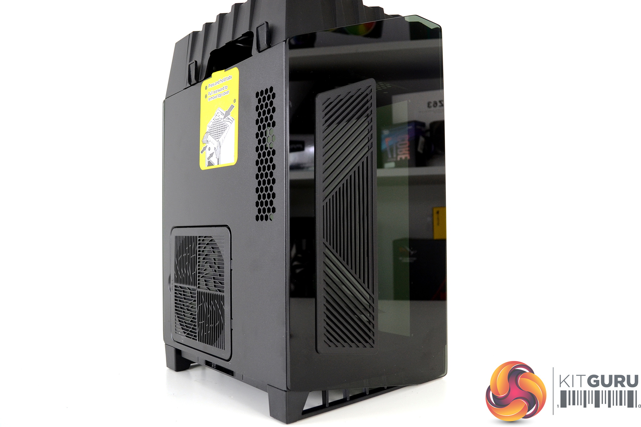 With the case spun round 180⁰, we can see the tempered glass side panel that has the new GPU intake vent added. The vent is constructed from a plastic outer gill with an integrated woven plastic mesh dust filter. The vent can be removed from the glass panel for cleaning purposes.