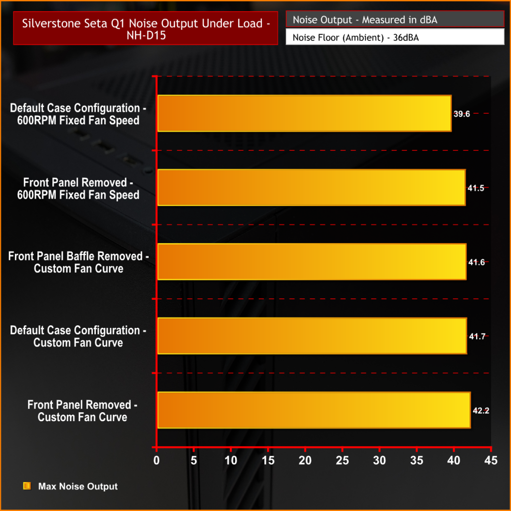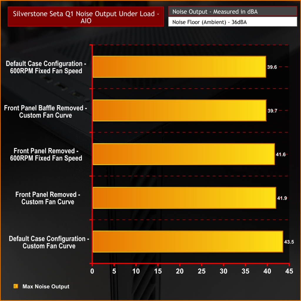 Normally in a case designed for positive front airflow, we would see around 2-3°C drop in CPU temperature at most when running our ‘front panel removed test'. But with the Seta Q1, removing the front panel reduced CPU temperature by a massive 11°C with a custom fan curve. This meant that the fan didn’t have to ramp up the RPM and therefore the case was much quieter when the front panel was removed, which in this scenario defeats the object of having a solid “low noise” front panel.