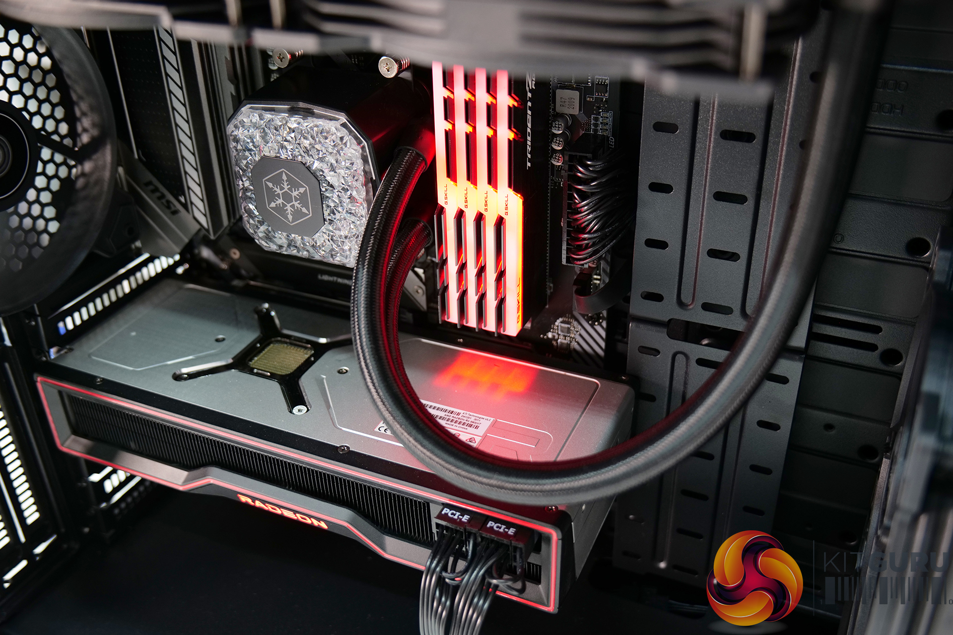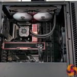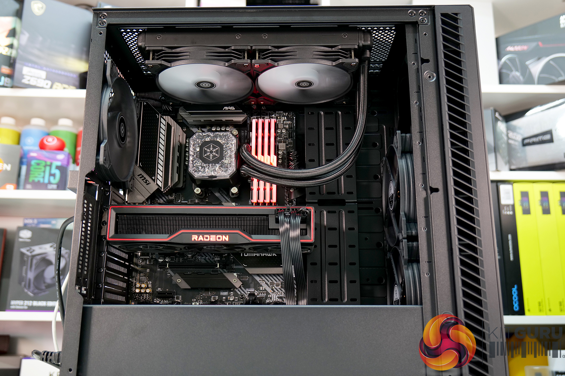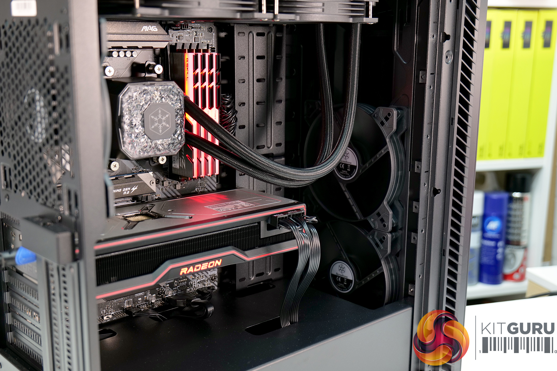 - Top-mounted AIO cooler, stock system fan locations, stock panel configuration, custom fan curve tuned for low noise.