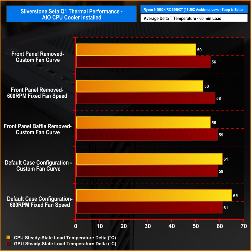 Thermal performance is measured with the case in various configurations, such as the factory default, and with the front panel removed to see how these configurations affect the CPU and GPU temperature. During testing, only stock case fans are used unless otherwise specified. All water pumps are set to maximum RPM and fans are set to a custom RPM Curve and/or fixed RPM by the Motherboard software/BIOS.