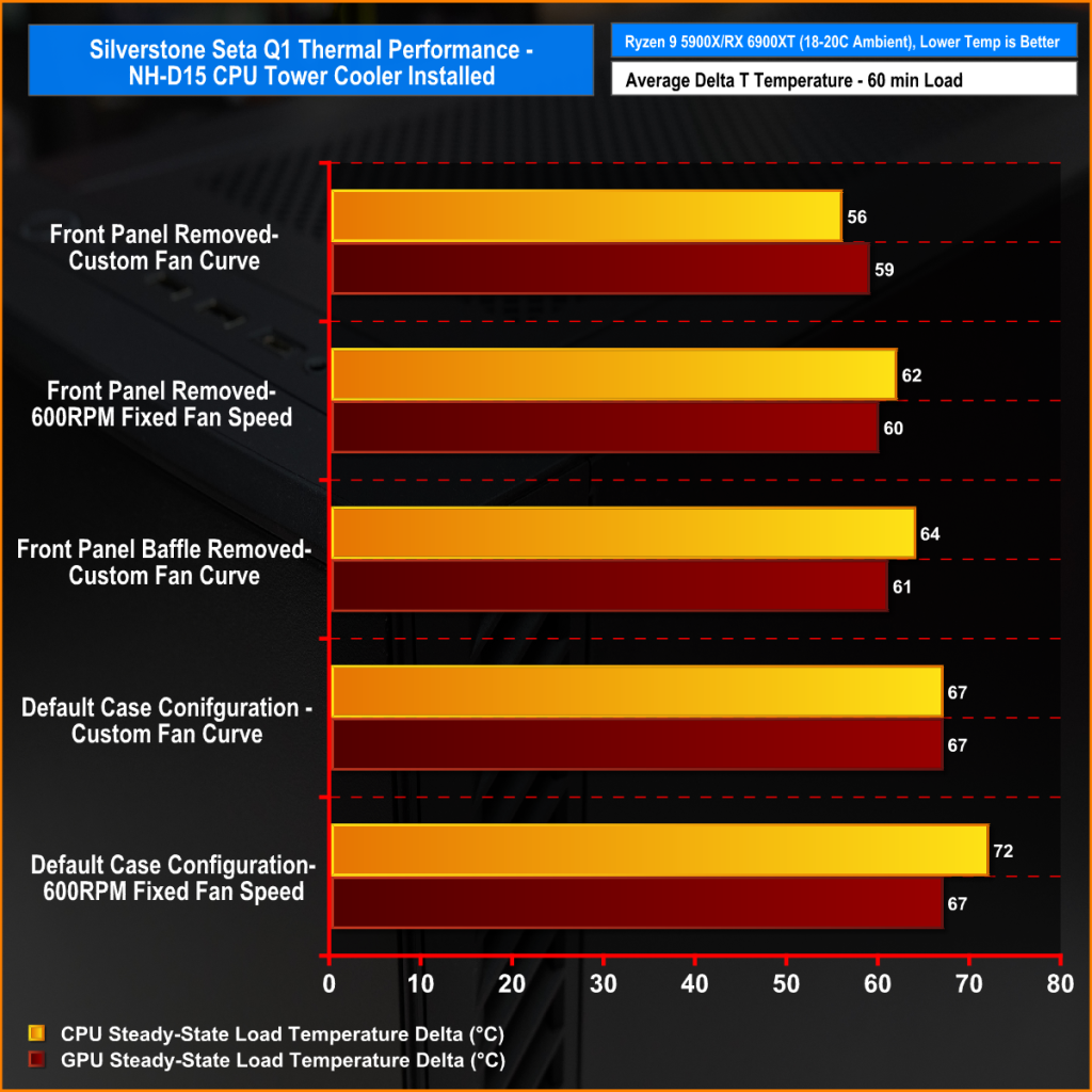 Removing the front panel gives the system a huge breath of fresh air and CPU temperature is dramatically reduced, both with the fans at their fixed RPM and when using a custom fan curve. We see up to 11°C drop in CPU temperature by removing the front panel which is possibly one of the most dramatic swings in CPU temperature during one of our case tests.