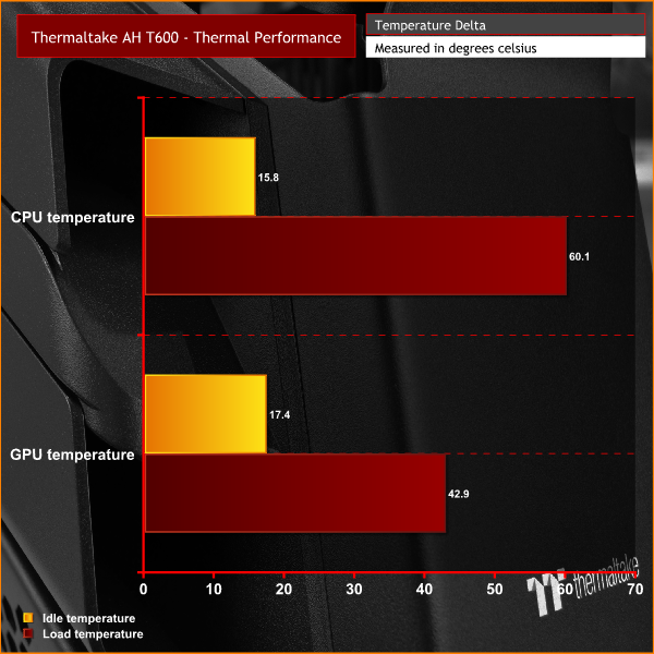 Since the Thermaltake AH T600 is technically an open frame test bench like chassis, we ran a series of simple tests to measure both thermal performance and noise levels at idle and under AIDA64 load stressing CPU, FPU, cache and GPU.