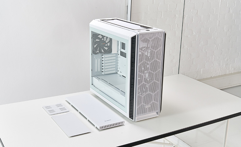 Last of all, we have the Silent Base 802, the successor to the Silent Base 801. This Silent Base 802 is basically the airflow version of the Silent Base 801 with updated connectors, which on paper seems quite good. The top cover and front panel are interchangeable between standard panels and meshed versions of them, designed to improve airflow. The front I/O panel was updated by replacing the USB 2.0 port with a USB-C 3.2 port with a maximum bandwidth of 10Gbps. This case will be available in black and white, with a solid and a windowed option.